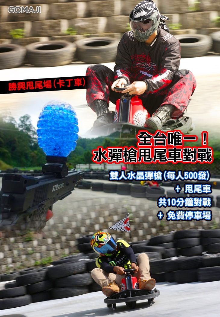 佔地500坪,能將甩尾車效能,發揮到極致的專業甩尾車跑道!適合大朋友、小朋友的遊戲,可甩尾享受飄移的刺激感,水彈槍甩尾車對戰,瞬間甩爆卡丁車正流行!快相揪親朋好友一同前來,盡情甩尾、同時甩開煩惱吧!