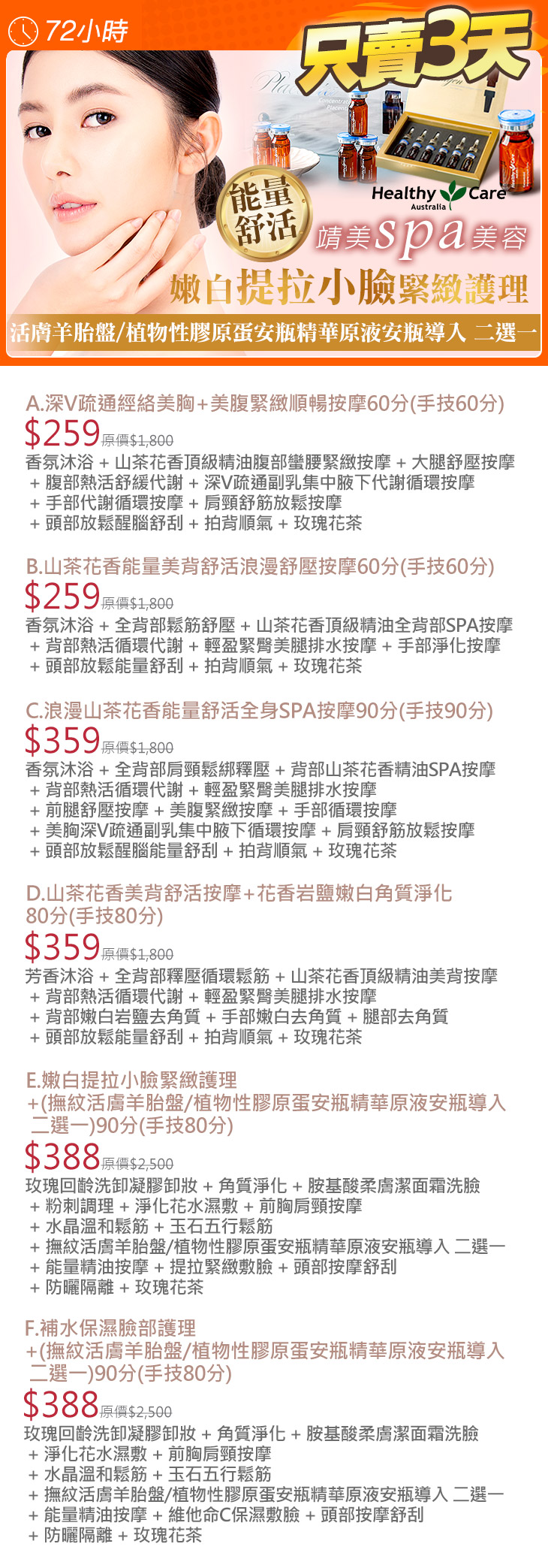 A.深V疏通經絡美胸+美腹緊緻順暢按摩60分(手技60分)/B.山茶花香能量美背舒活浪漫舒壓按摩60分(手技60分)/C.浪漫山茶花香能量舒活全身SPA按摩90分(手技90分)/D.山茶花香美背舒活按摩+花香岩鹽嫩白角質淨化80分(手技80分)/E.嫩白提拉小臉緊緻護理+(撫紋活膚羊胎盤/植物性膠原蛋安瓶精華原液安瓶導入 二選一)90分(手技80分)/F.補水保濕臉部護理+(撫紋活膚羊胎盤/植物性膠原蛋安瓶精華原液安瓶導入 二選一)90分(手技80分)