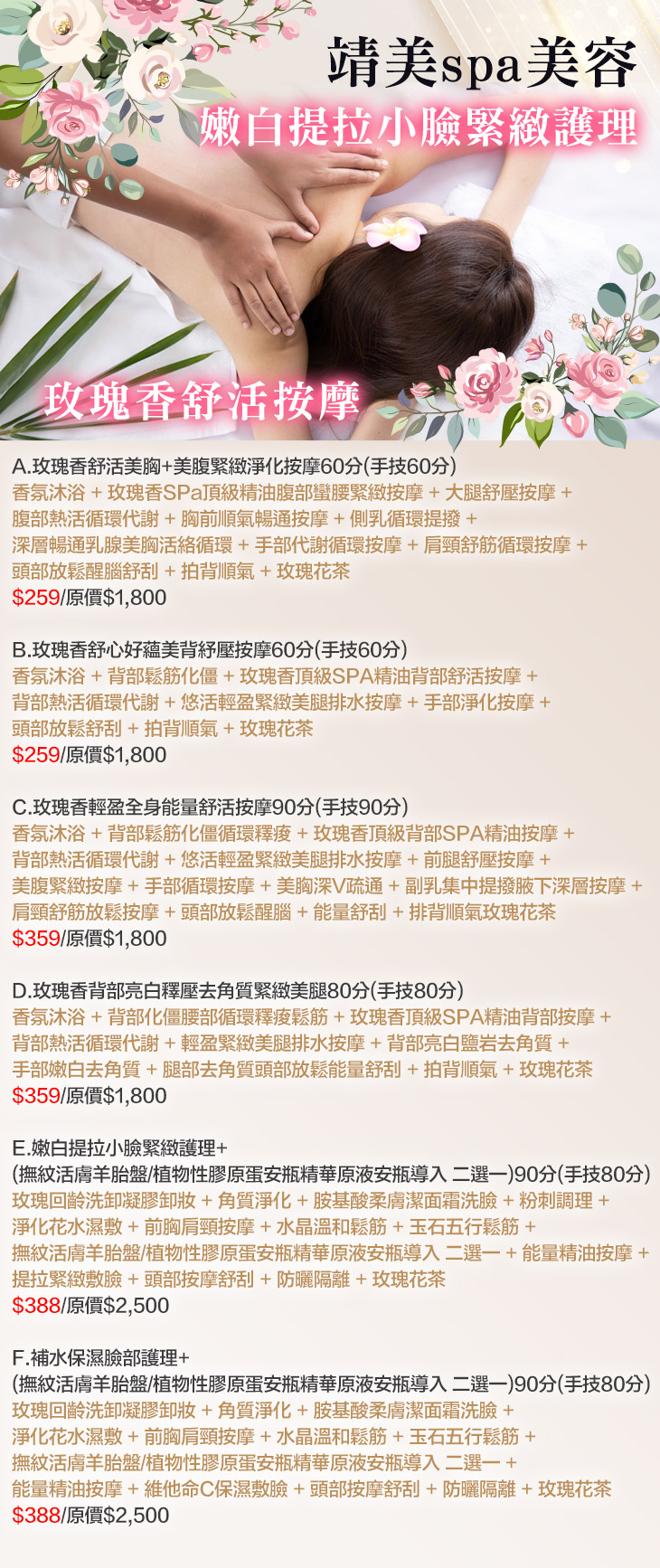 A.玫瑰香舒活美胸+美腹緊緻淨化按摩60分(手技60分) / B.玫瑰香舒心好蘊美背紓壓按摩60分(手技60分) / C.玫瑰香輕盈全身能量舒活按摩90分(手技90分) / D.玫瑰香背部亮白釋壓去角質緊緻美腿80分(手技80分) / E.嫩白提拉小臉緊緻護理+(撫紋活膚羊胎盤/植物性膠原蛋安瓶精華原液安瓶導入 二選一)90分(手技80分) / F.補水保濕臉部護理+(撫紋活膚羊胎盤/植物性膠原蛋安瓶精華原液安瓶導入 二選一)90分(手技80分)