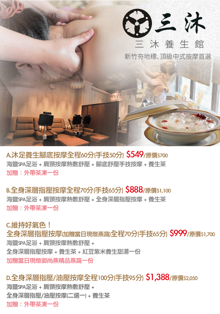 A.沐足養生腳底按摩全程60分(手技50分) / B.全身深層指壓按摩全程70分(手技65分) / C.維持好氣色!全身深層指壓按摩(加贈當日現燉燕窩)全程70分(手技65分) / D.全身深層指壓/油壓按摩全程100分(手技95分)