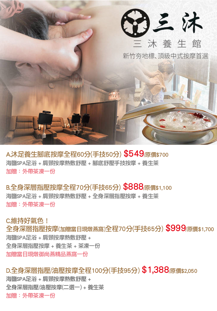 A.沐足養生腳底按摩全程60分(手技50分) / B.全身深層指壓按摩全程70分(手技65分) / C.維持好氣色!全身深層指壓按摩(加贈當日現燉燕窩)全程70分(手技65分) / D.全身深層指壓/油壓按摩全程100分(手技95分)