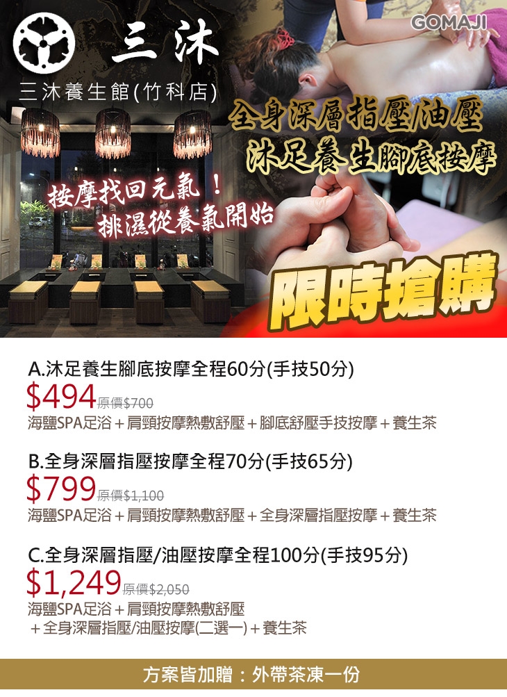 A.沐足養生腳底按摩全程60分(手技50分) / B.全身深層指壓按摩全程70分(手技65分) / C.全身深層指壓/油壓按摩全程100分(手技95分)