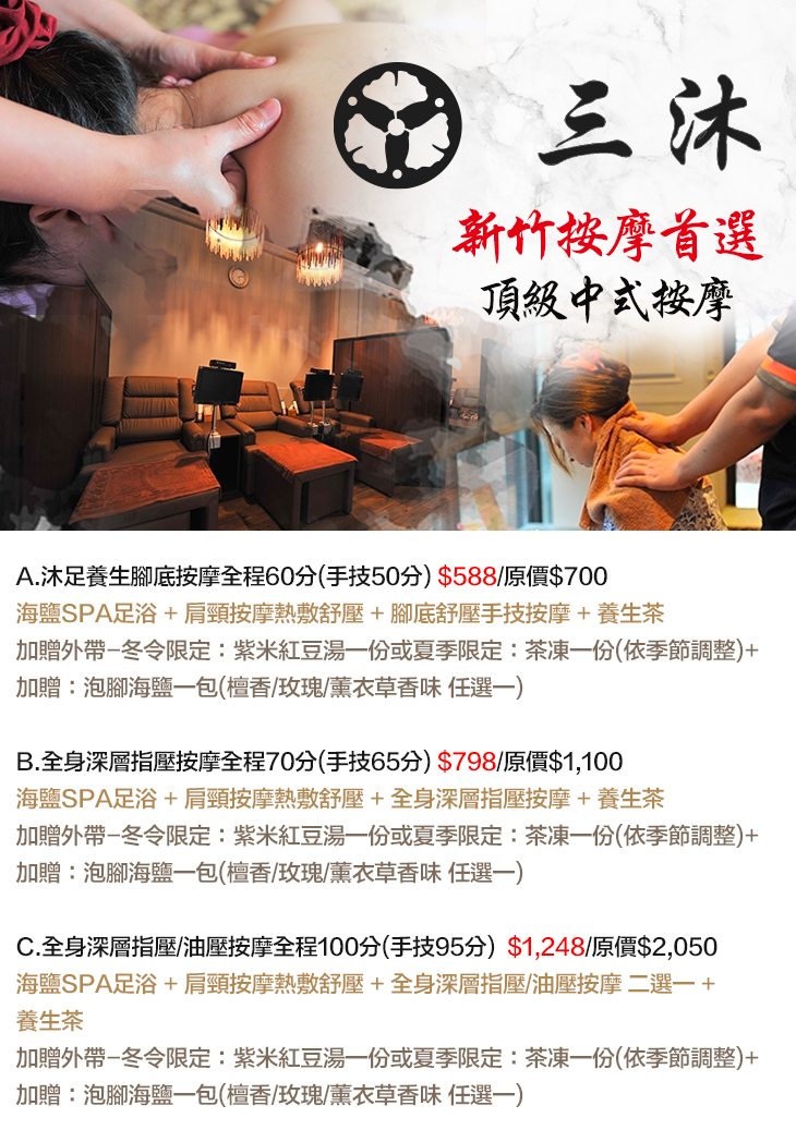 A.沐足養生腳底按摩全程60分(手技50分) / B.全身深層指壓按摩全程70分(手技65分) / C.全身深層指壓/油壓按摩全程100分(手技95分)