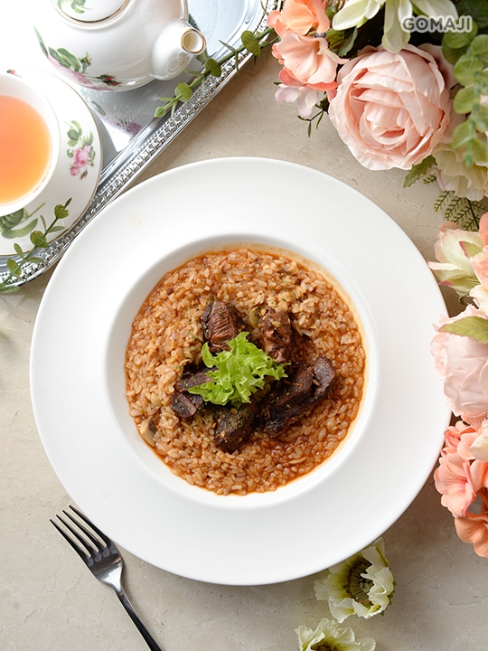 粒粒分明的勃根地紅酒煨牛肉燉飯,浸滿牛肉的香氣,滿盈入嘴裡,好吃到破表!