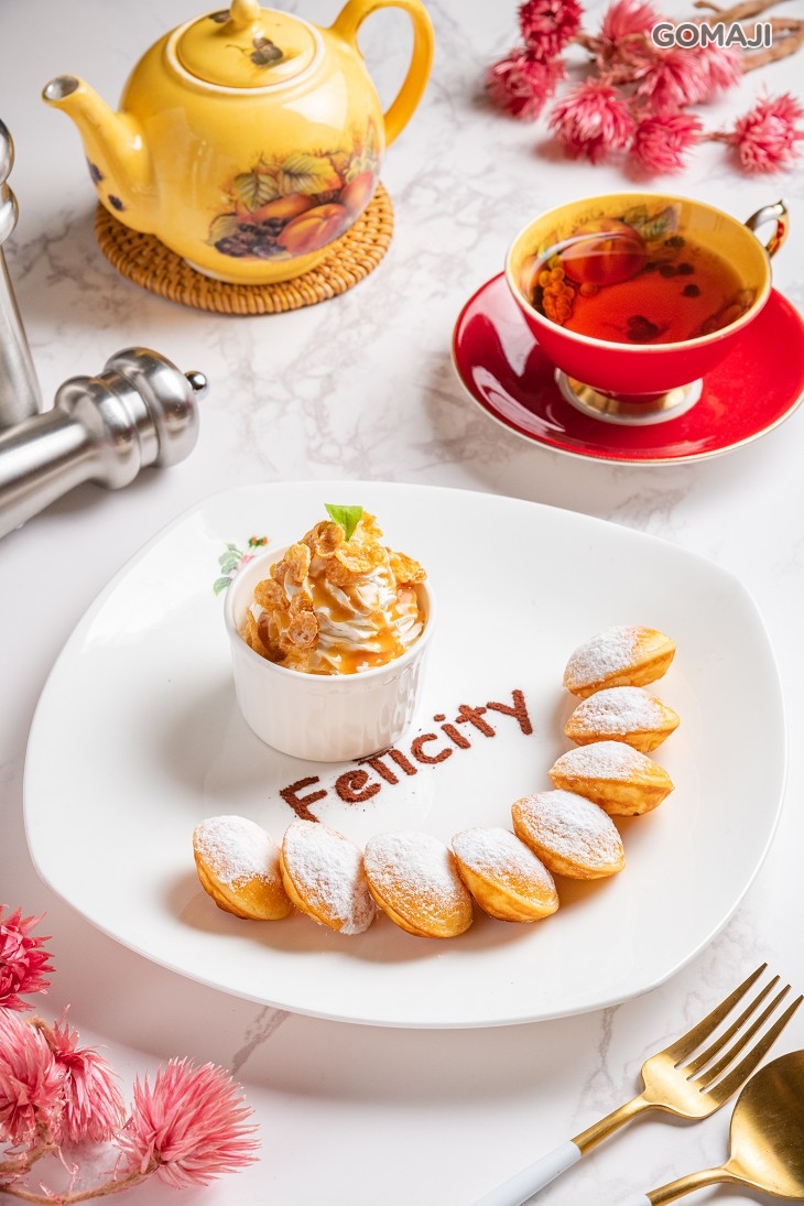 有別於一般的鬆餅造型,將鬆餅設計成可以小口品嚐,讓您能更優雅地享受下午茶輕食。烤得香軟宜人、細膩綿密的荷蘭小鬆餅,撒上如雪花般細緻的糖粉點綴,增添香氣與口感,伴隨一旁的鮮奶油脆片享用,甜蜜的滋味瞬間融化您的味蕾!