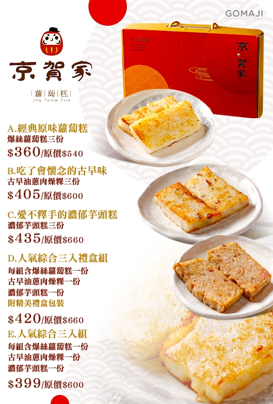 A.經典原味蘿蔔糕 / B.吃了會懷念的古早味 / C.愛不釋手的濃郁芋頭糕 / D.人氣綜合三入禮盒組 / E.人氣綜合三入組
