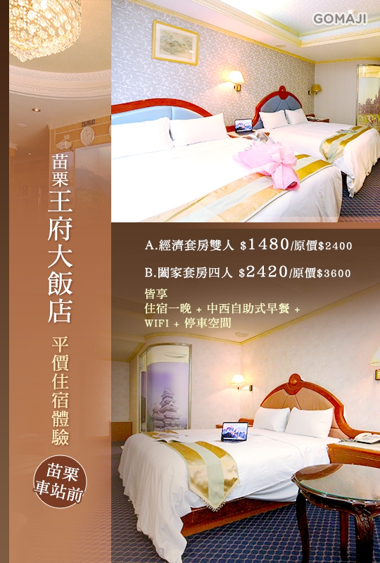 座落於苗栗火車站旁,地處苗栗地區之交通輻輳。採用高雅的空間規劃,讓您在王府親身體驗貴族般禮遇。以住客安全、衛生為第一考量前題下,床單衛浴用品皆為精選的素材,備有高科技反偵測儀器,以維護隱私與寧靜,讓您高枕無憂。讓您在一天的忙碌後,舒緩情緒和壓力,滌去疲憊,充分感受王府體貼入微的用心。