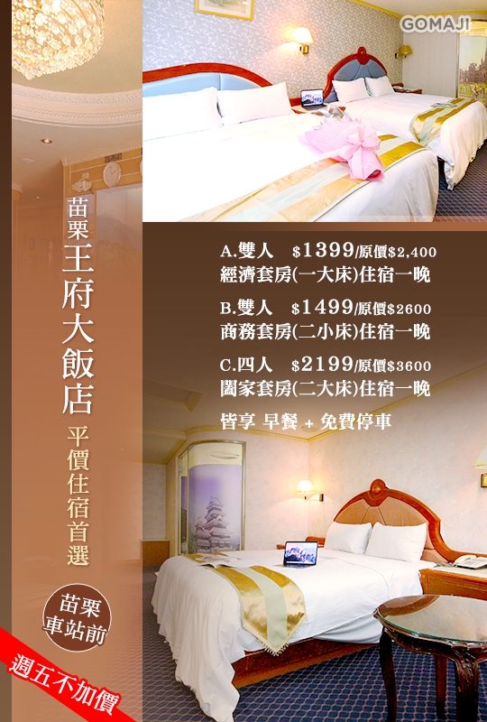 座落於苗栗火車站旁,地處苗栗地區之交通輻輳。採用高雅的空間規劃,讓您在王府親身體驗貴族般禮遇。以住客安全、衛生為第一考量前題下,床單衛浴用品皆為精選的素材,備有高科技反偵測儀器,以維護隱私與寧靜,讓您高枕無憂。讓您在一天的忙碌後,舒緩情緒和壓力,滌去疲憊,充分感受王府體貼入微的用心。