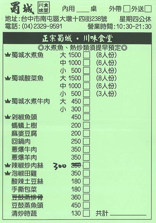 位於台中市南屯區大墩十四街238號,近公益商圈!主廚來自四川,將最正宗的家鄉味原汁原味搬來台灣,以麻、辣、鮮、香聞名的川菜料理,經過主廚巧手製作,比例掌握精細,辣中帶麻、麻中帶香的美味讓人意猶未盡,給您最道地的川菜料理!從家常小吃到豐盛的美食餐宴通通有,歡迎大家來品嚐!