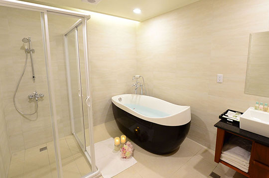 推窗見湖,清晨的薄霧、日間的粼粼波光、黃昏的絕美晚霞,盡收眼底!進口獨立筒床墊、質感羽絨被,您可以在陽台飽覽山水風光,一邊品嚐香醇咖啡。寬敞獨立衛浴內設有頂級浴缸,溫潤的黑白流線外型,符合人體工學設計,在此入浴,可以徹底放鬆身心。