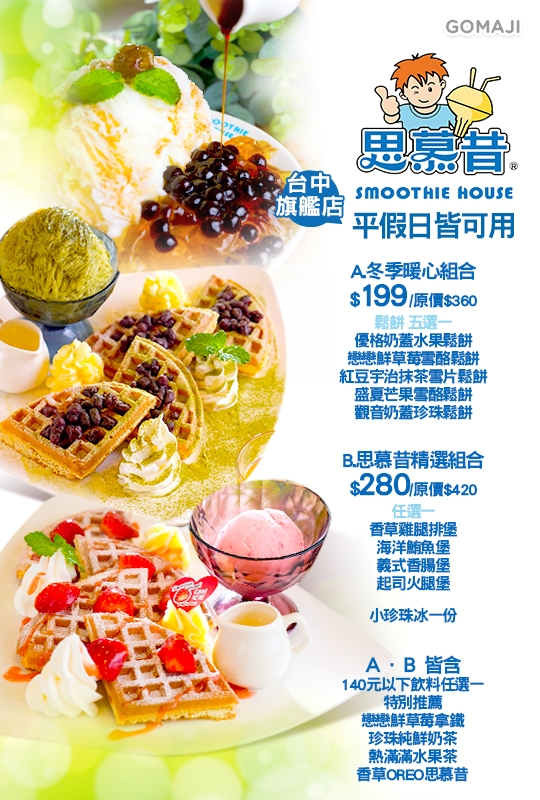 思慕昔提供五種美味鬆餅,除經典草莓與芒果鬆餅外,更推出了抹茶、優格以及珍珠奶茶口味,熱騰騰的現烤鬆餅,配上雪花冰、雪酪、香濃奶蓋及珍珠等配料,帶給您最美好的午後時光。