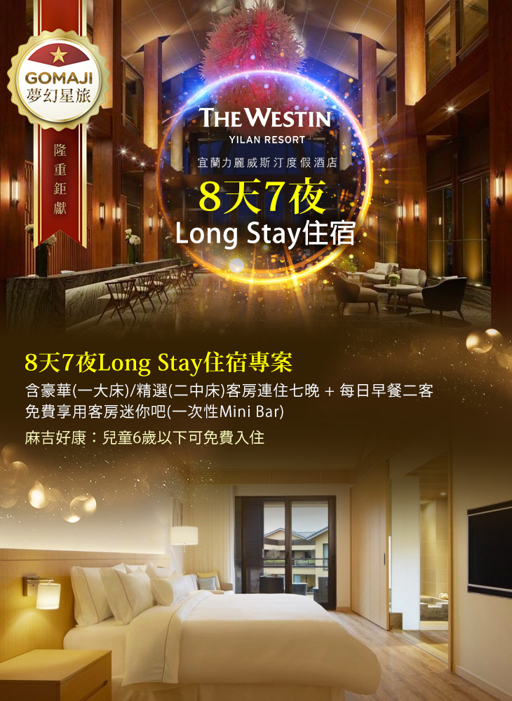 ★ 無法出國,就來宜蘭五星力麗威斯汀8天7夜Long Stay,在此放慢腳步、感受最FUN鬆不被打擾的悠閒時光,讓身心靈都得到昇華!