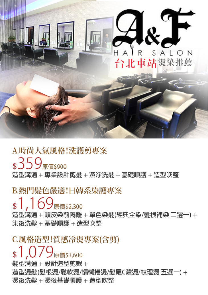 近捷運台北車站M7出口,約2分鐘即可到達,交通非常便利!店內擁有經驗豐富的髮型設計師,不僅專業於各種髮型設計,剪髮、染髮、燙髮和護髮技術都是一流,細心的服務態度更是讓人放鬆自在,滿足您的需求~店內環境舒適明亮,讓顧客在美髮的同時能放鬆心情。【A&F Hair Salon】將為您提供高品質的髮型服務,讓每位顧客都能享受到專業、舒適的美髮體驗!