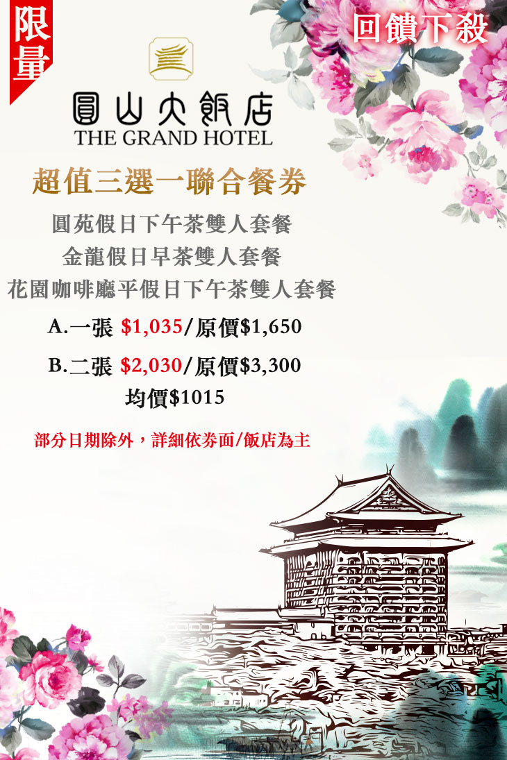 限量回饋下殺!超值三選一聯合餐券一張 (任選:圓苑假日下午茶雙人套餐/金龍假日早茶雙人套餐/花園咖啡廳平假日下午茶雙人套餐)(部分日期除外,詳細依券面/飯店為主)