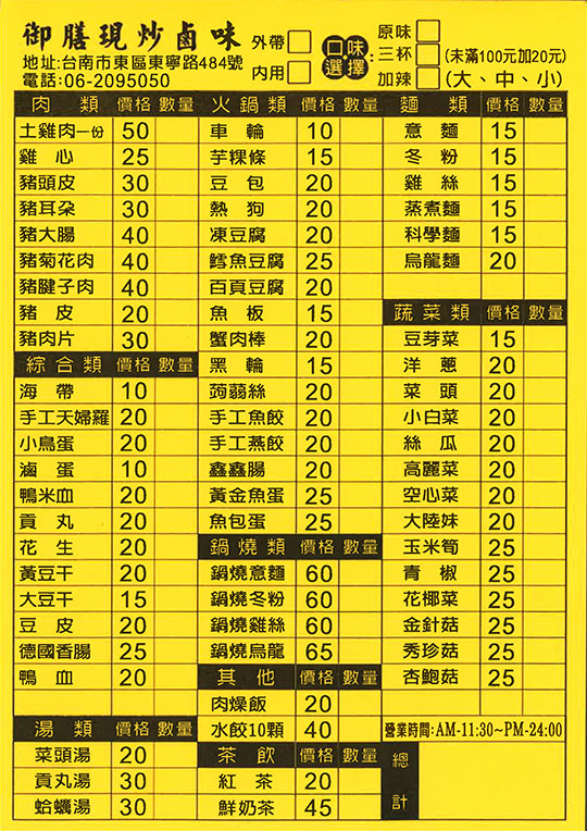 位於台南市東區東寧路484號,近南紡夢時代購物中心!打破大家對於傳統滷味的印象,創意研發滷味新吃法,多種中藥材滷製的食材,尤其三杯口味經過現炒,口感更是鹹香夠味!光聞香氣就忍不住讓人口水直流啊!店內滷味選擇超多樣,無論是肉品、蔬菜、火鍋料,應有盡有,還有不容錯過的招牌鍋燒系列,濃郁鮮美湯頭搭配煮至恰到好處的麵條,絕對能滿足您的口腹之慾!最香醇的現炒滷味,等著老饕們一同來品嚐!