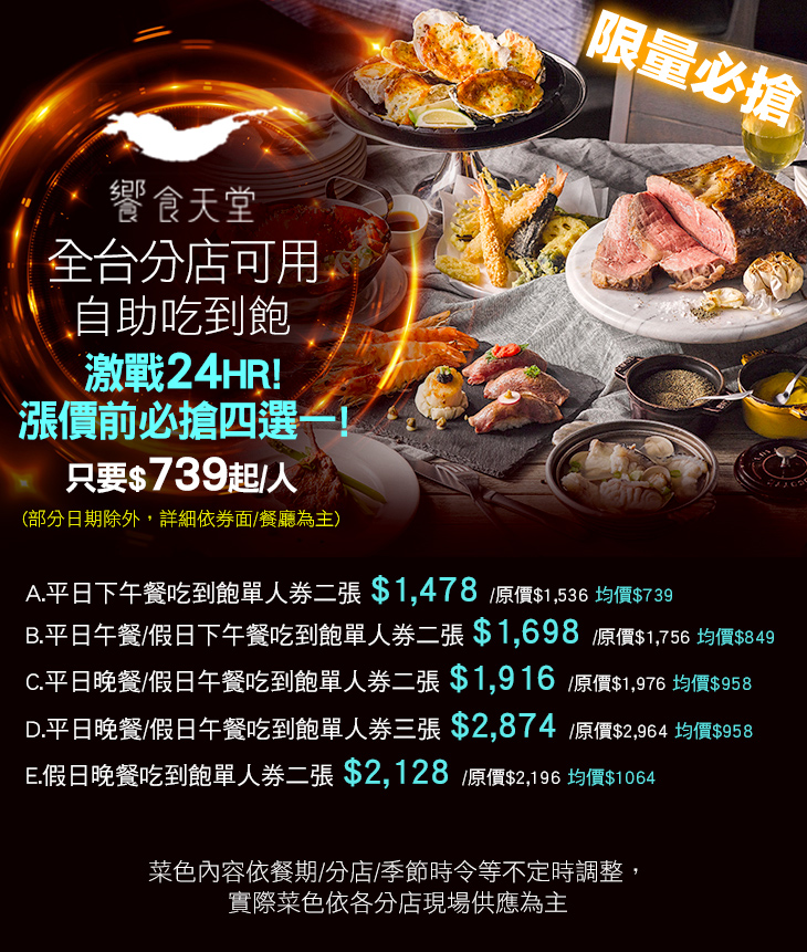 激戰24HR!漲價前必搶四選一!平日下午餐吃到飽單人券 / 平日午餐/假日下午餐吃到飽單人券 / 平日晚餐/假日午餐吃到飽單人券 / 假日晚餐吃到飽單人券