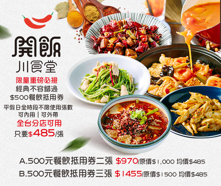 全台分店可用!限量重磅必搶!承襲福利川菜四十年的正統手藝,認真選用天然食材,巧妙調配複雜多樣的辛香料,下手刀工精細,快火燒煎炒,用最熱血的心,為你端上翻騰味蕾的川正味料理。透過講究的味型、用料、工法,鮮香麻辣的川菜,千年來人氣歷久不衰。開飯保留了川正味瞬間爆發的食感,以輕鬆新穎的方式上菜,就像一個熱情奔放的好朋友,歡樂相聚,暢快上癮。你真的可以感受到每一口裡都有我們的用心,所以,每一口都吃得很開心。鮮香麻辣正川味~請你來開飯!