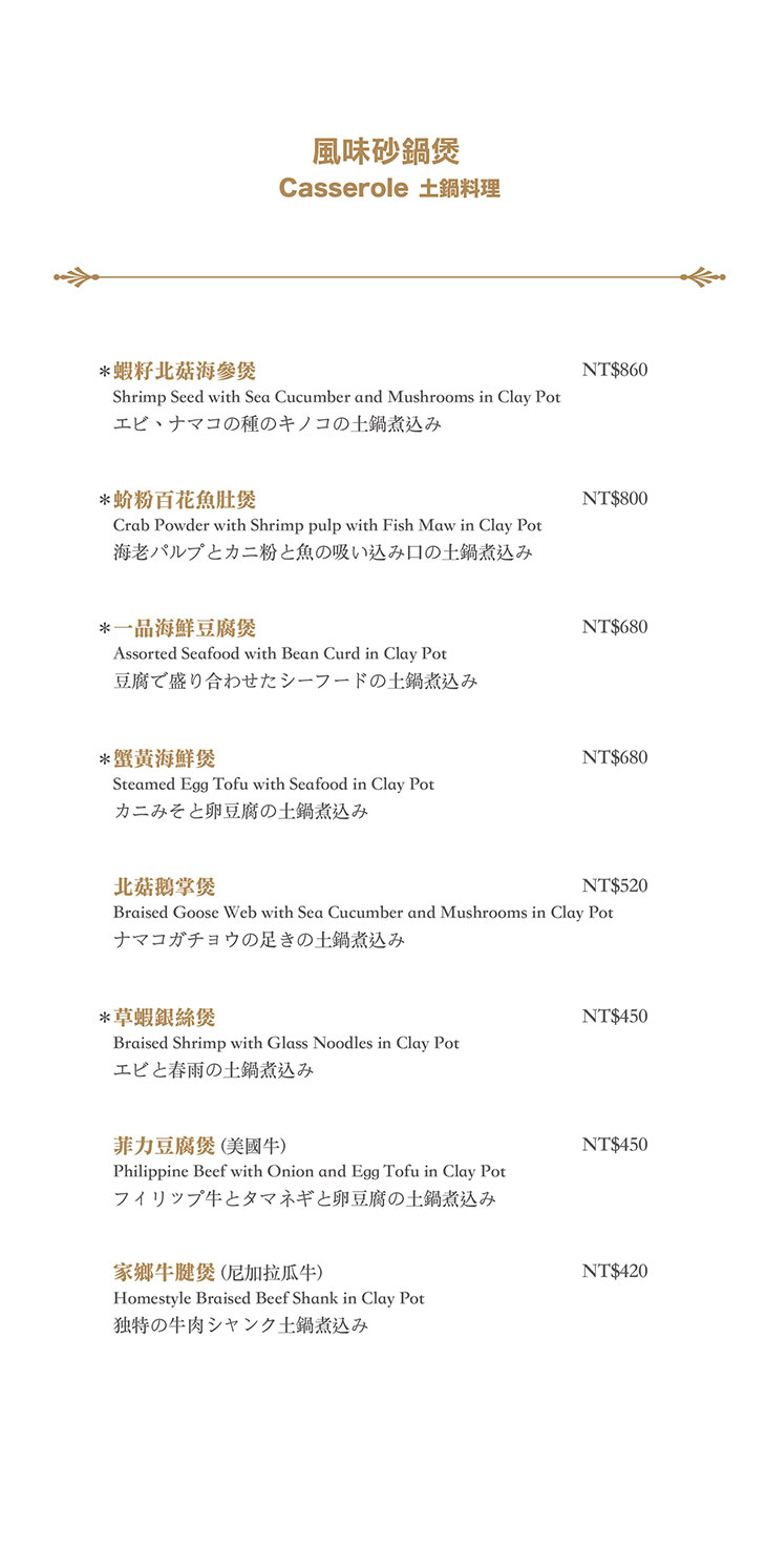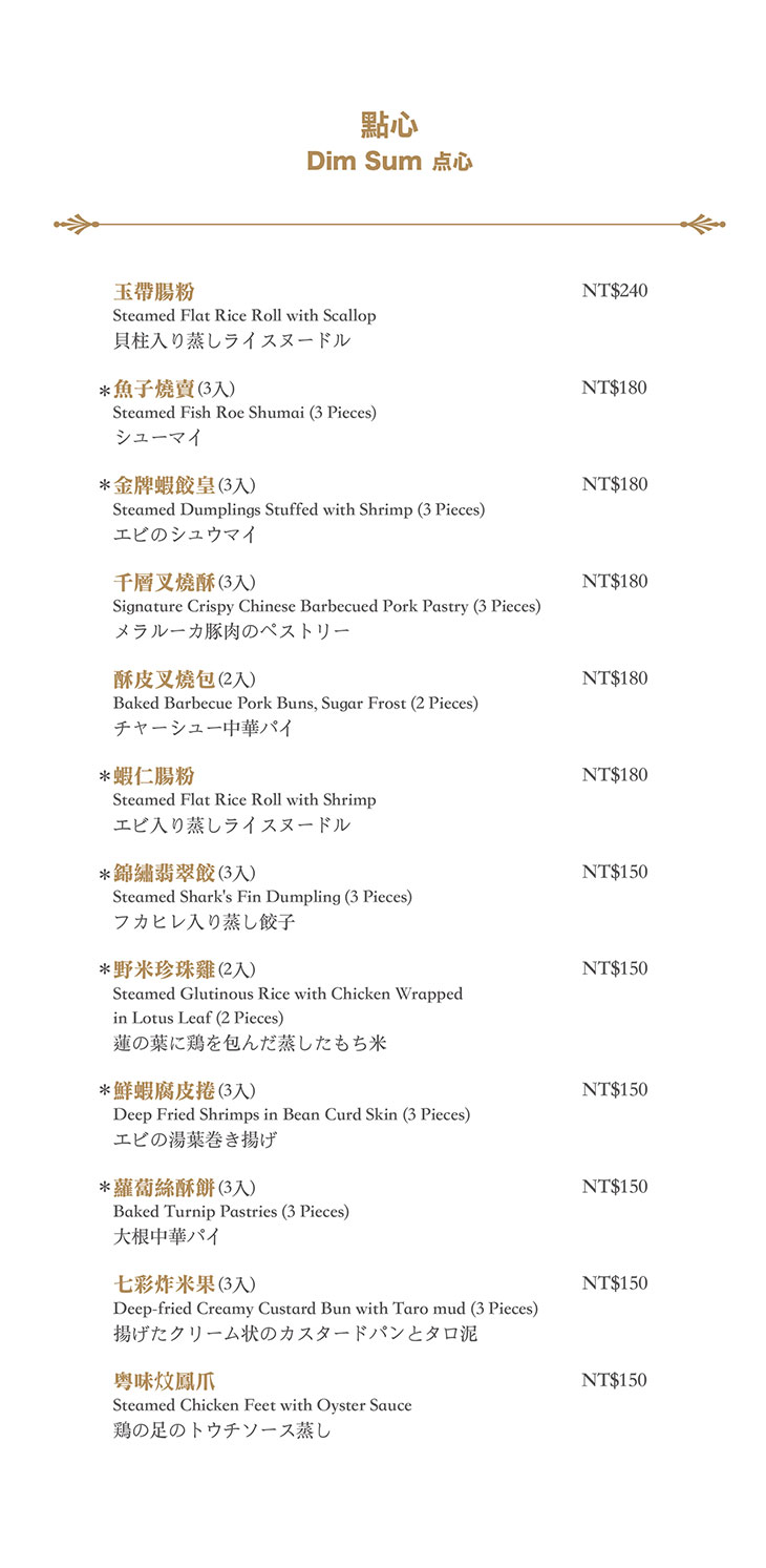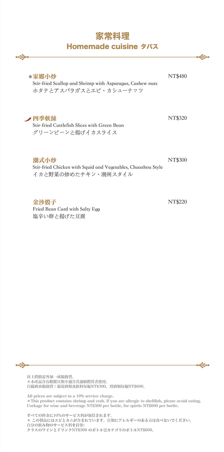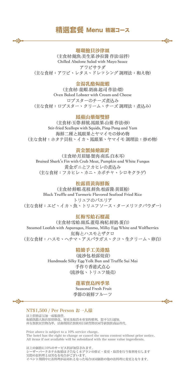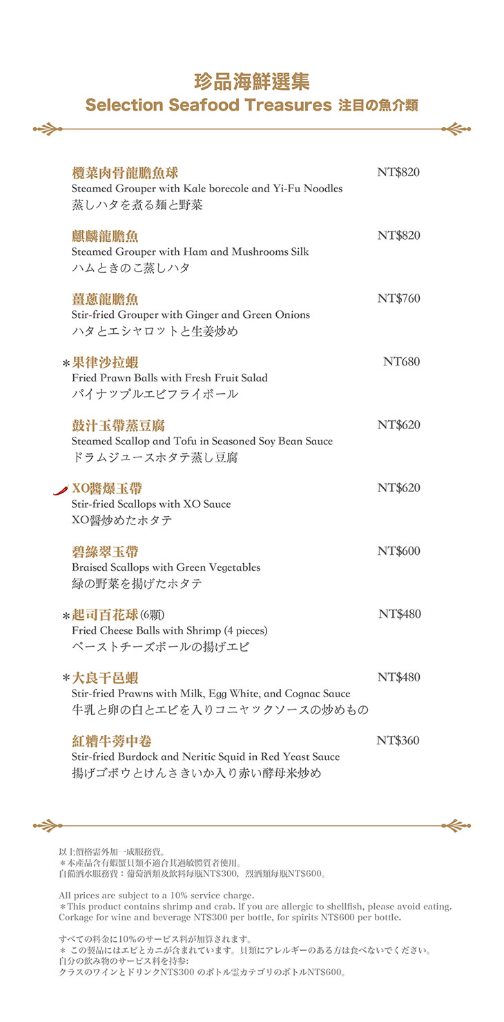 在餐點菜單的取向設計,主廚團隊以台灣在地食材並結合大中華各式家鄉料理,兼具跨越不同菜系獨有的料理方式,並以精心細緻烹調手法呈現不一樣的中餐廳風貌!