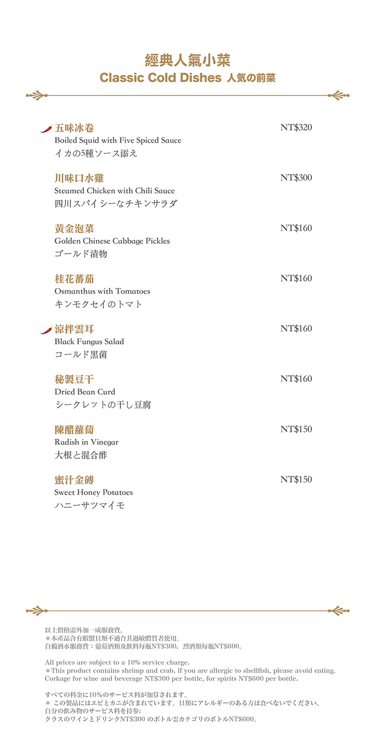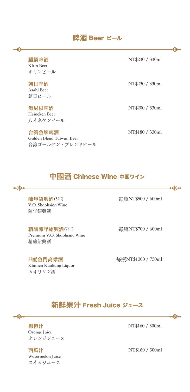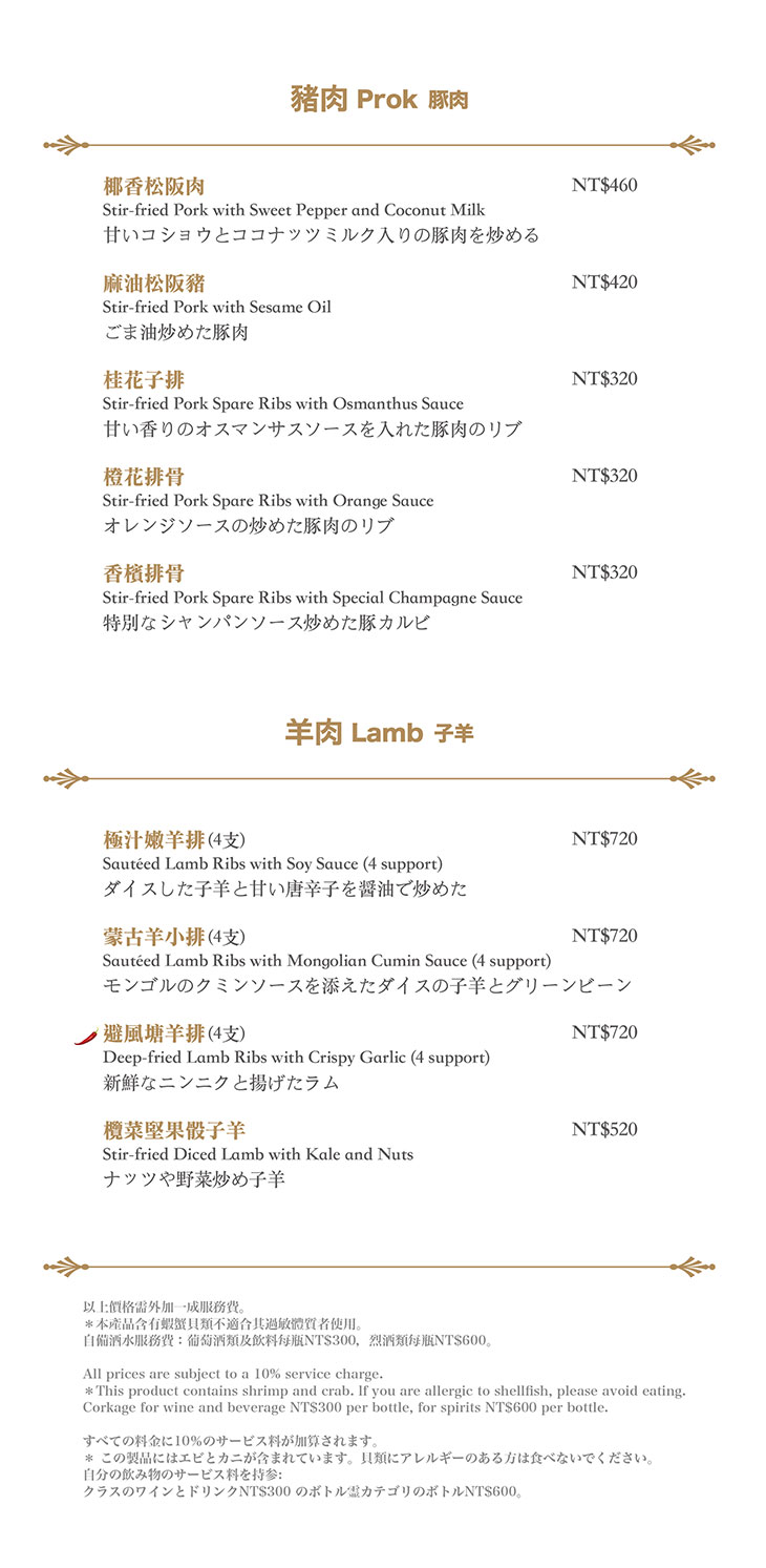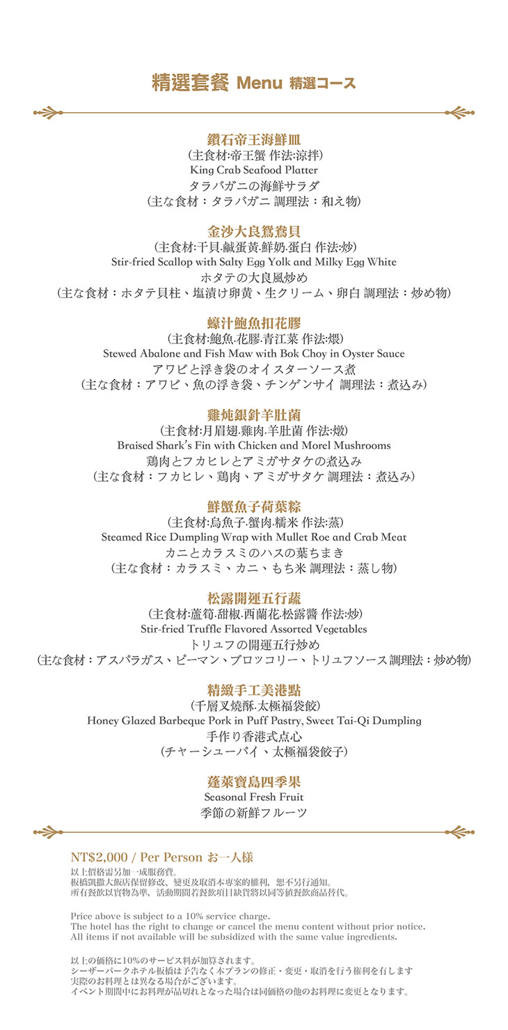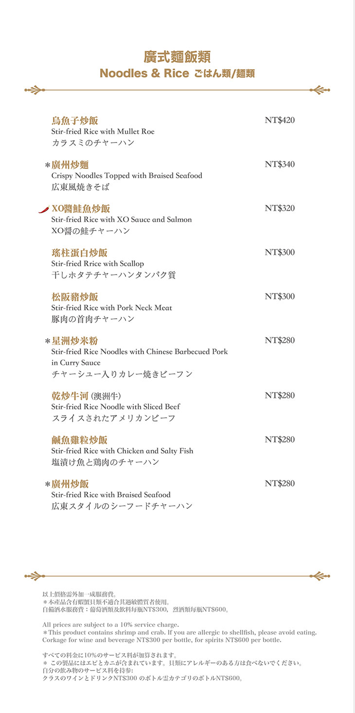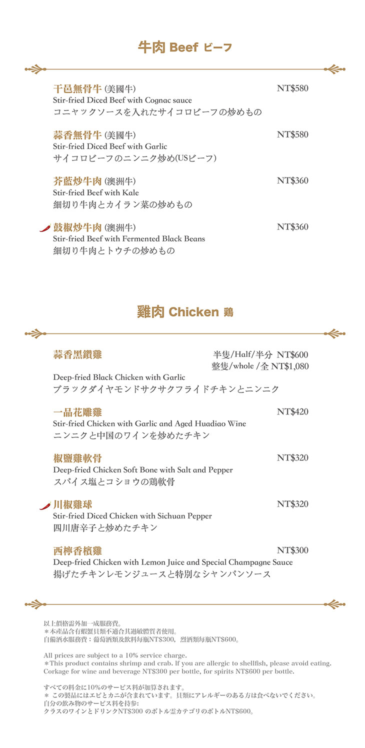 在餐點菜單的取向設計,主廚團隊以台灣在地食材並結合大中華各式家鄉料理,兼具跨越不同菜系獨有的料理方式,並以精心細緻烹調手法呈現不一樣的中餐廳風貌!
