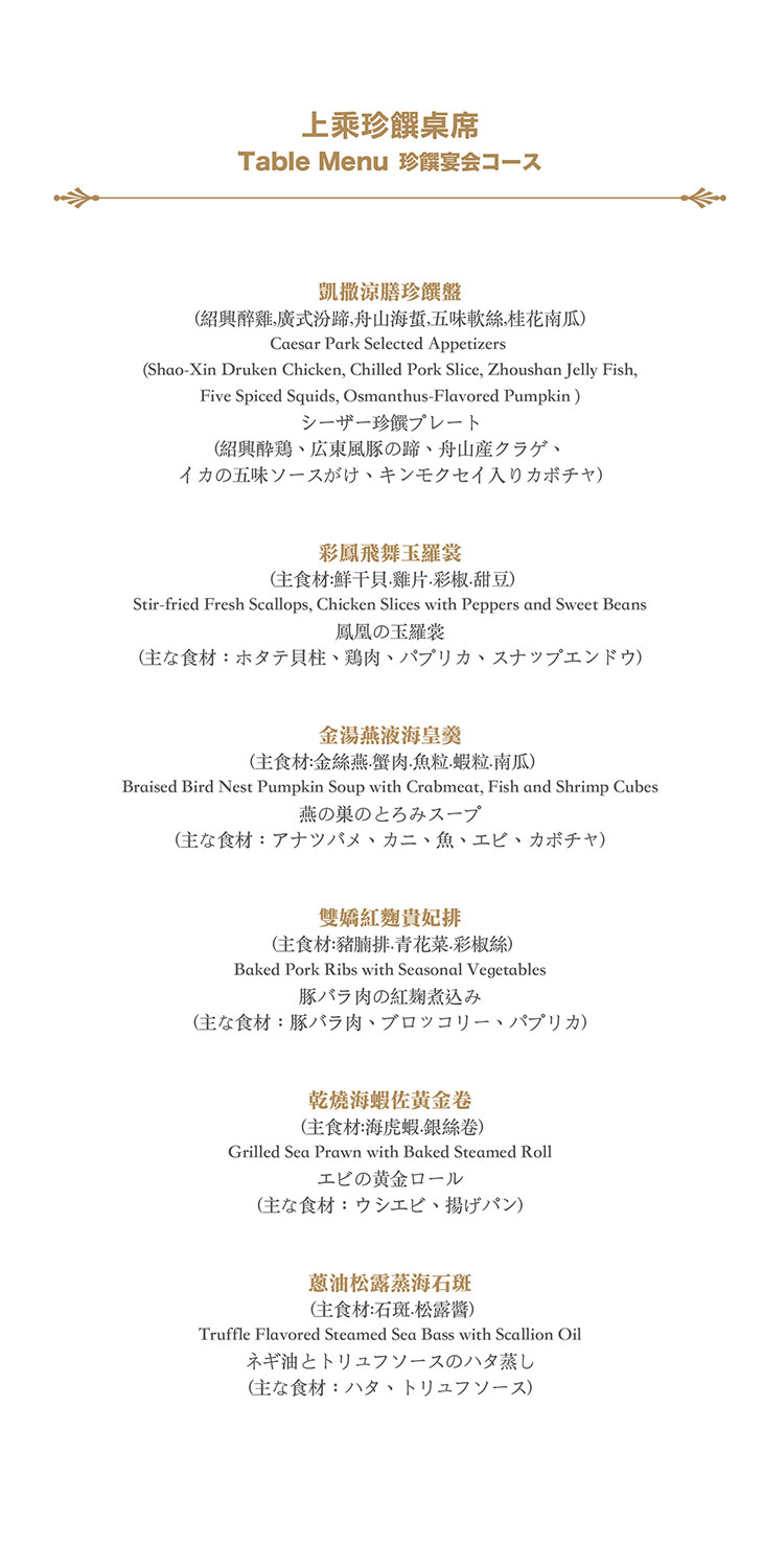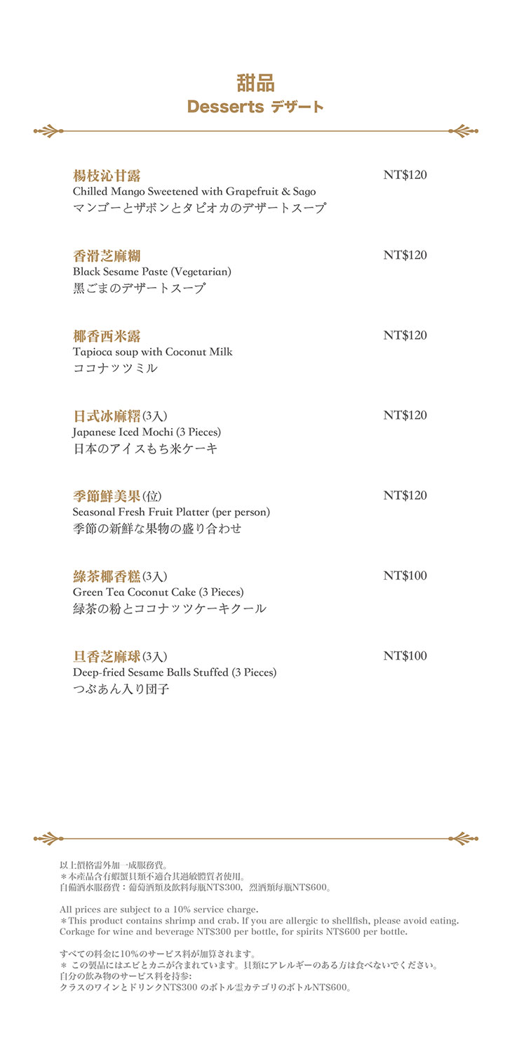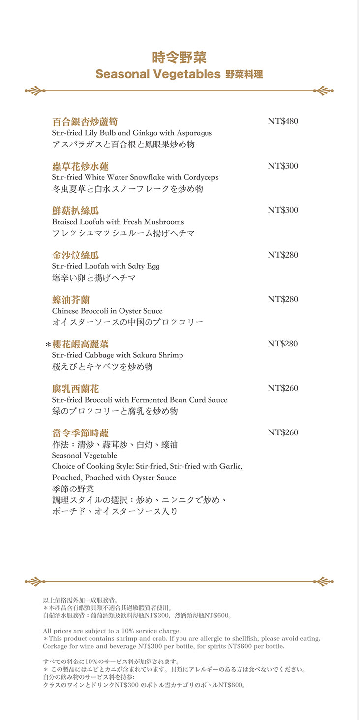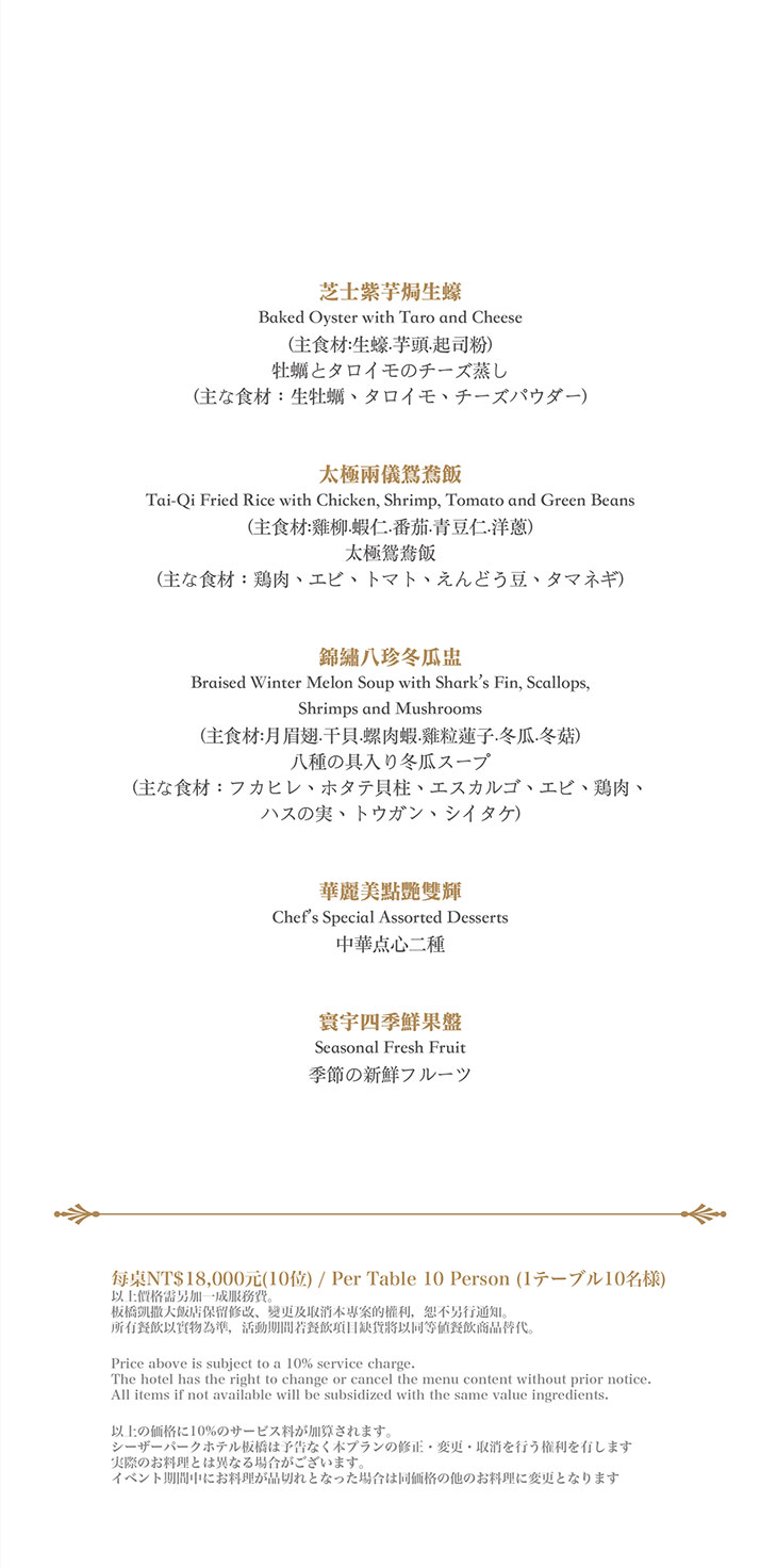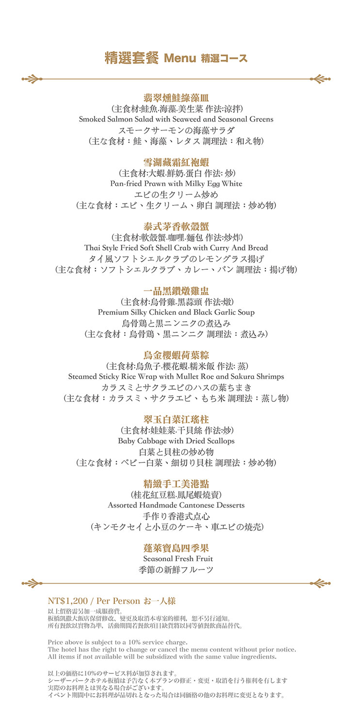 在餐點菜單的取向設計,主廚團隊以台灣在地食材並結合大中華各式家鄉料理,兼具跨越不同菜系獨有的料理方式,並以精心細緻烹調手法呈現不一樣的中餐廳風貌!