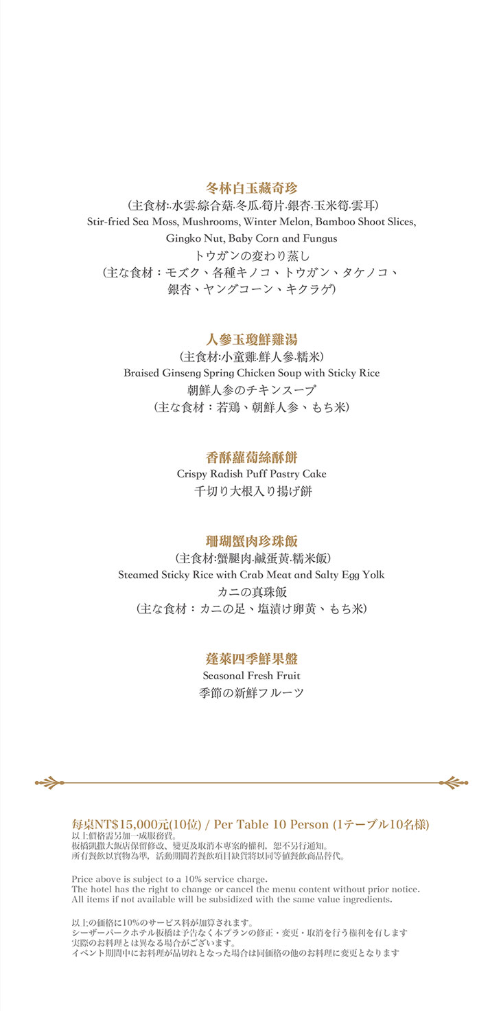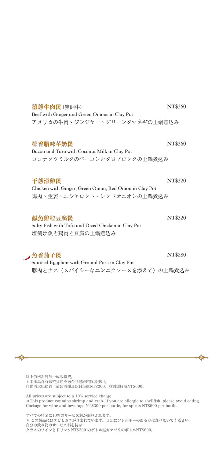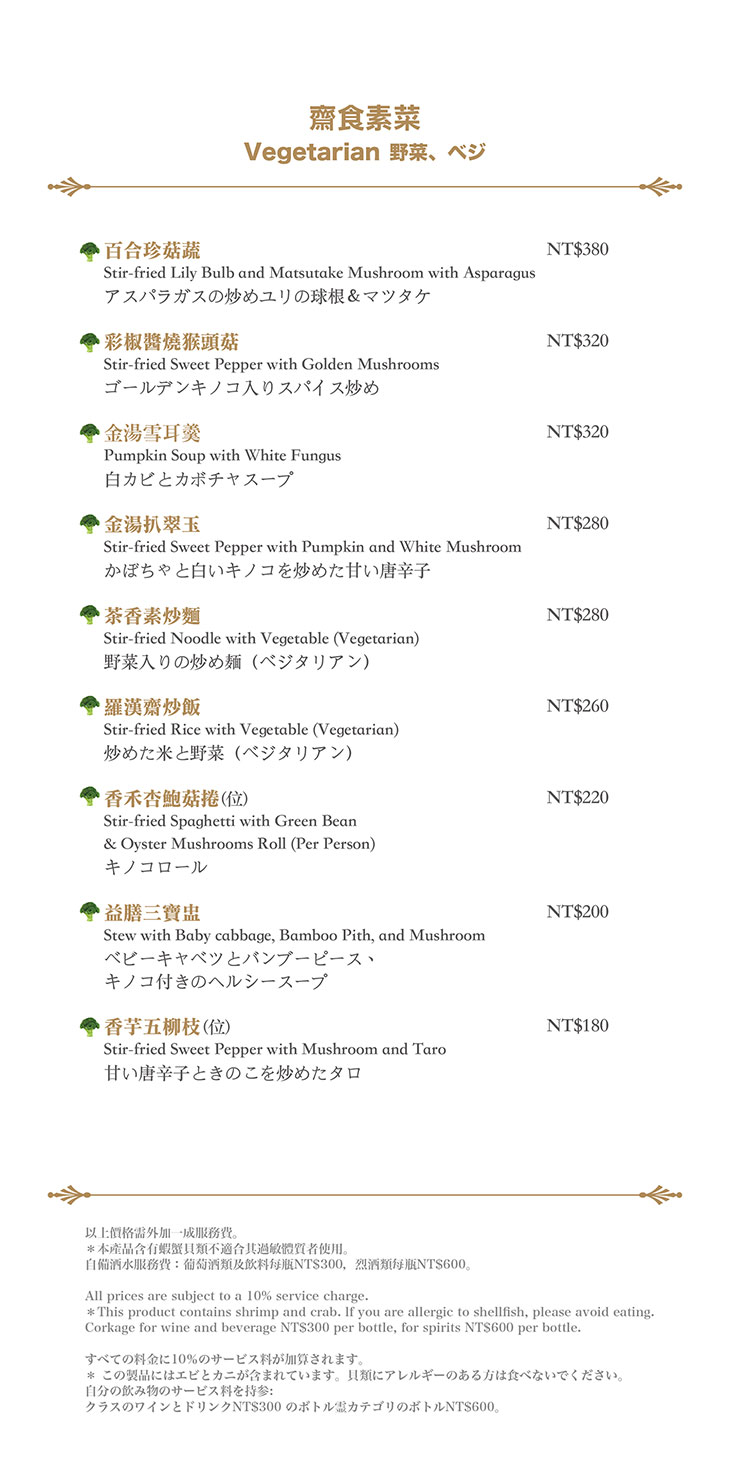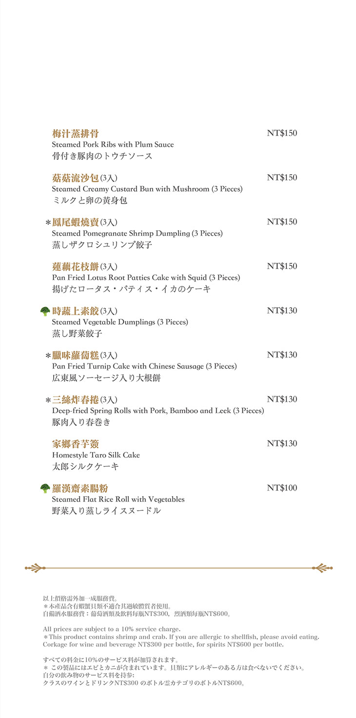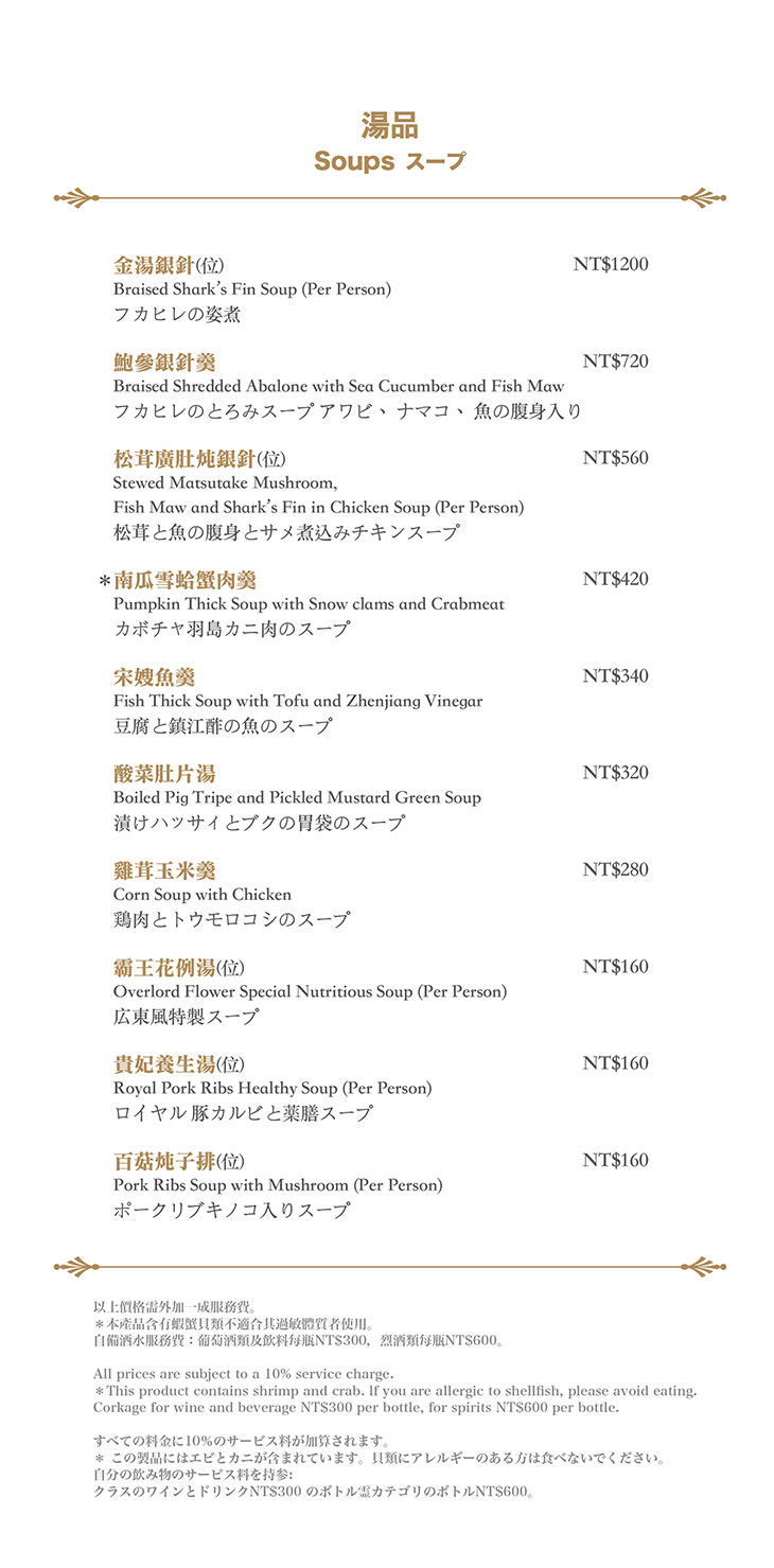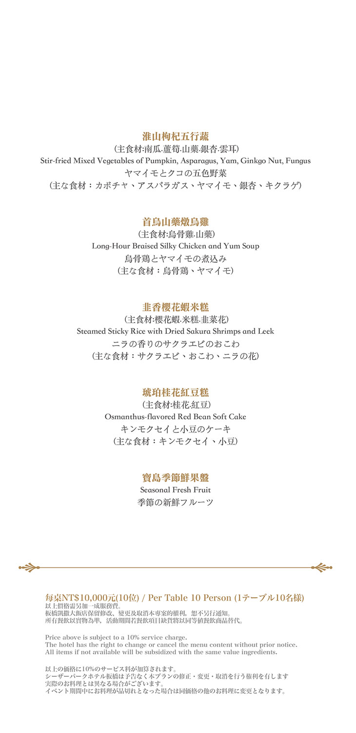 在餐點菜單的取向設計,主廚團隊以台灣在地食材並結合大中華各式家鄉料理,兼具跨越不同菜系獨有的料理方式,並以精心細緻烹調手法呈現不一樣的中餐廳風貌!