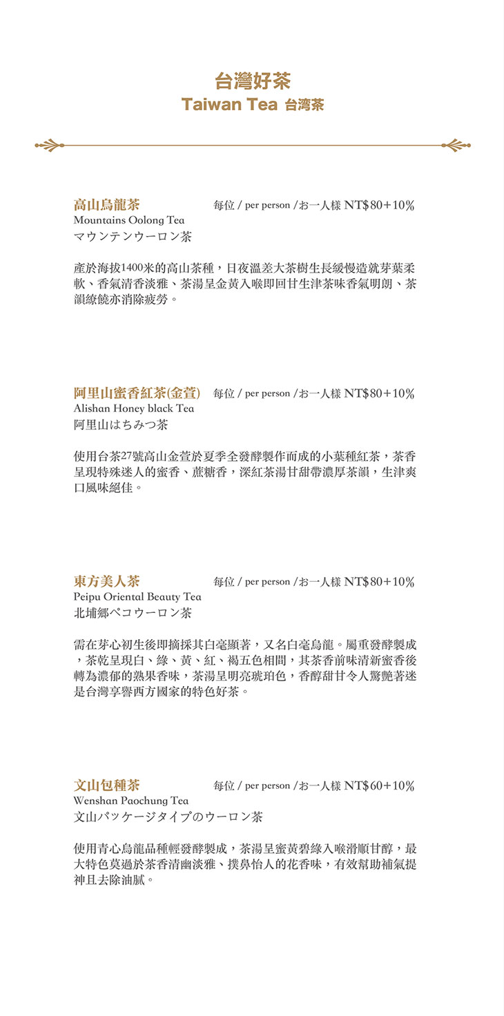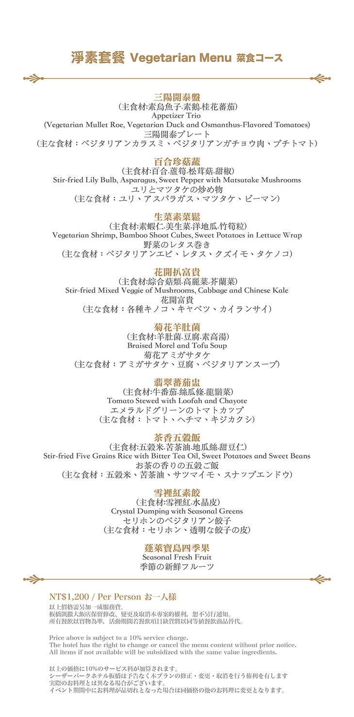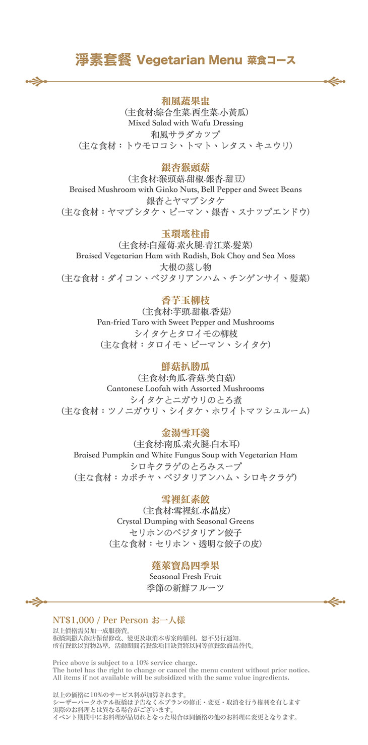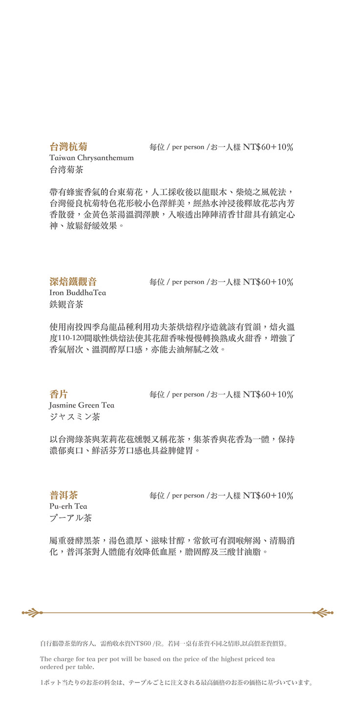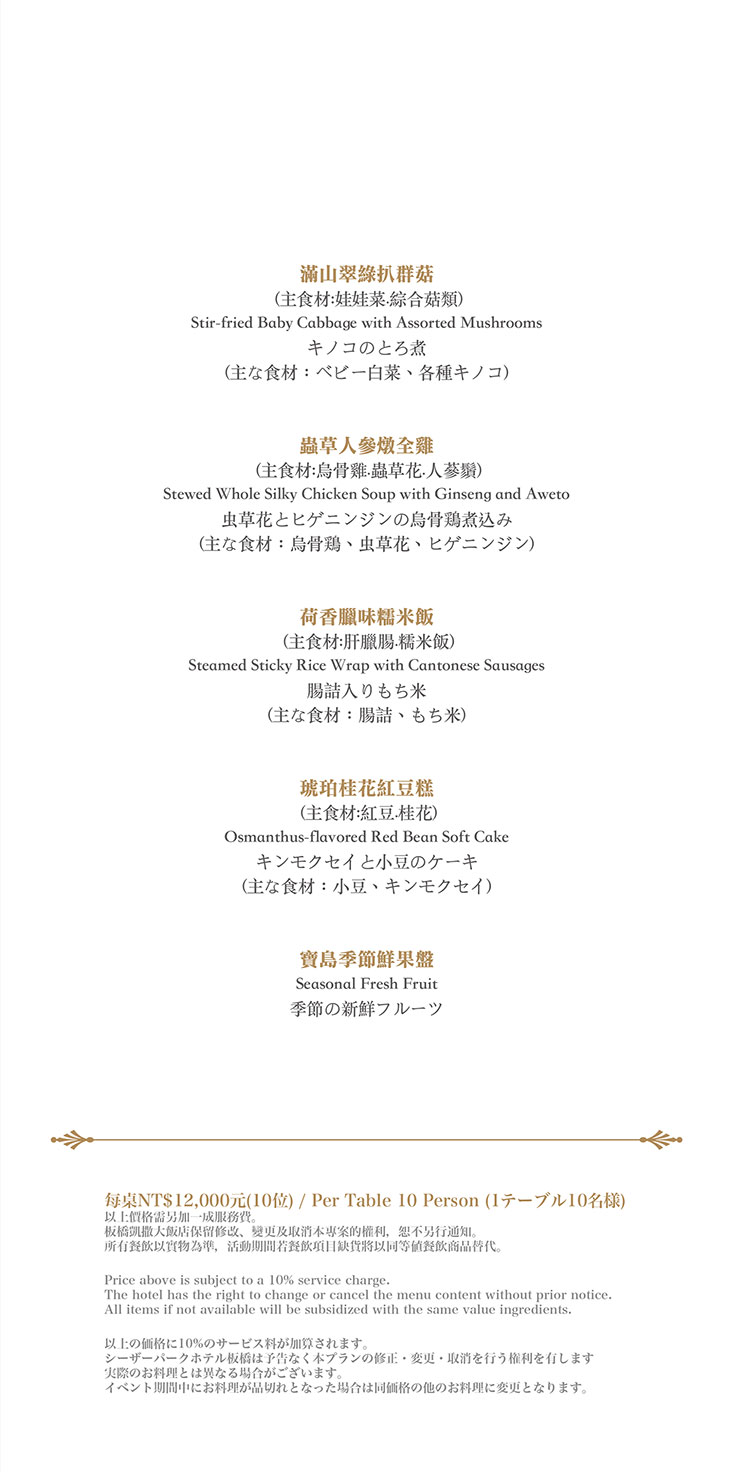 在餐點菜單的取向設計,主廚團隊以台灣在地食材並結合大中華各式家鄉料理,兼具跨越不同菜系獨有的料理方式,並以精心細緻烹調手法呈現不一樣的中餐廳風貌!