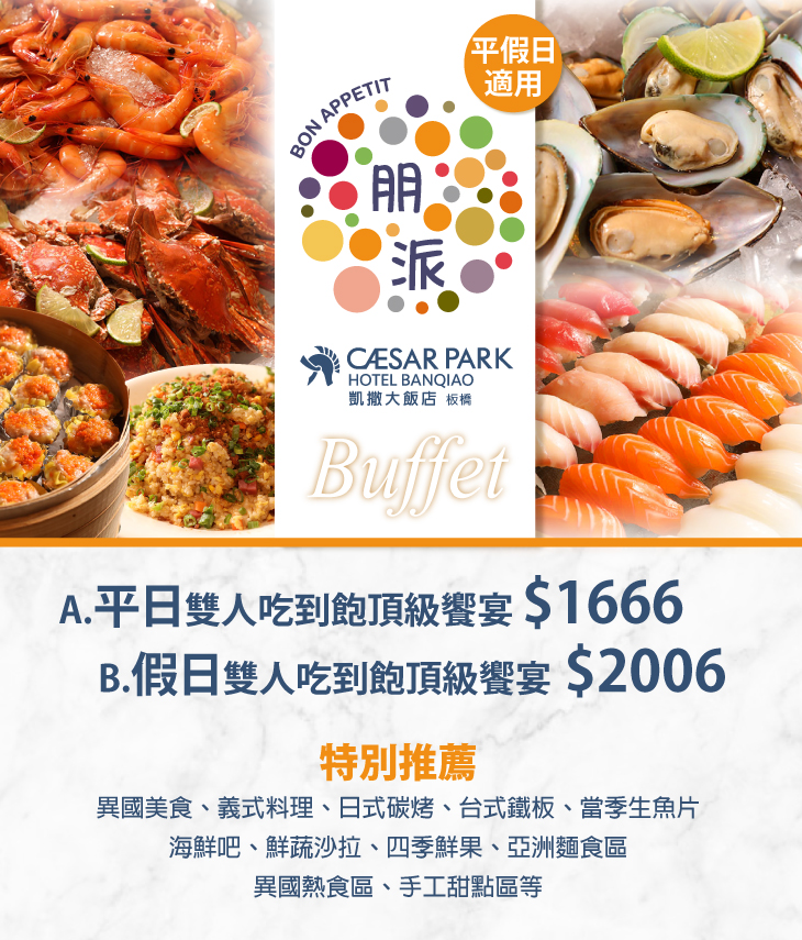 集結中西各式主題料理、經由主廚團隊精心規劃,提供六大主題、多樣特色美食,例如多款日式生魚片及手捲、鮮美時令海鮮、精選義式料理、各式異國美味熱食、日式天婦及現煎鐵板區、清爽時蔬沙拉吧、現煮麵食、色彩繽紛精緻甜點、四季鮮果等!