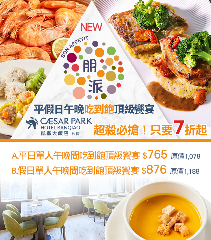 由板橋凱撒大飯店一手策劃的朋派自助餐,一直都是許多人品味自助餐食的首選!此次與GOMAJI聯手推出超殺優惠,讓您以經濟實惠的價位,便能品味多國特色美食!不分平假日的限定,更是讓您想揪團、就揪團!現在就手刀下單,相邀親朋好友們一同來聚餐享樂吧!