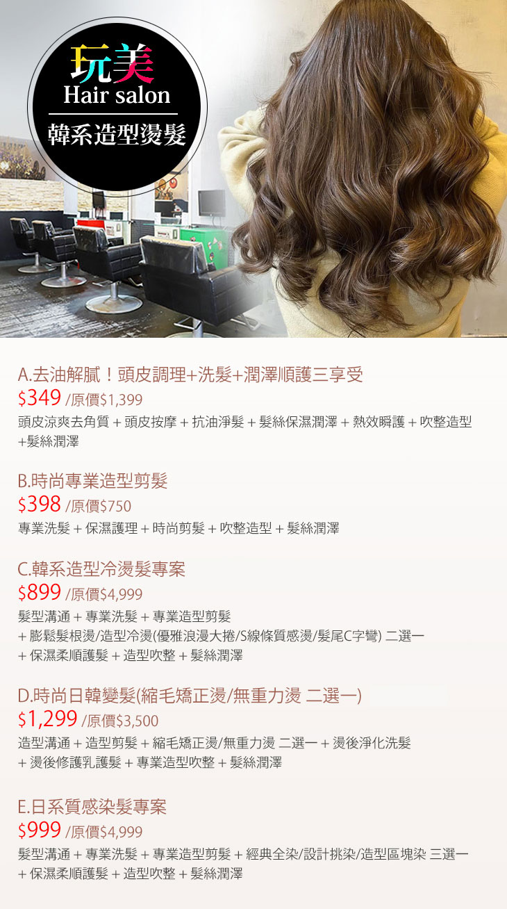 A.去油解膩!頭皮調理+洗髮+潤澤順護三享受 / B.時尚專業造型剪髮 / C.韓系造型冷燙髮專案 / D.時尚日韓變髮(縮毛矯正燙/無重力燙 二選一) / E.日系質感染髮專案