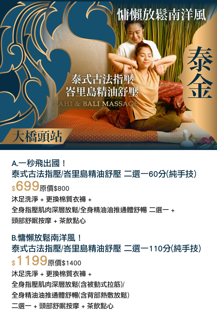 B.慵懶放鬆南洋風!泰式古法指壓/峇里島精油舒壓 二選一110分(純手技)