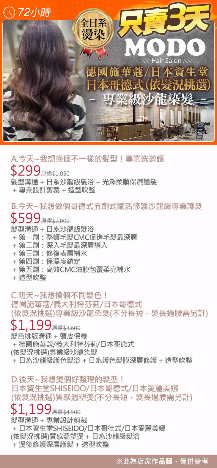 A.今天~我想換個不一樣的髮型!專業洗剪護 / B.今天~我想做個哥德式五劑式賦活修護沙龍級專業護髮 / C.明天~我想換個不同髮色!德國施華蔻/義大利特芬莉/日本哥德式(依髮況挑選)專業級沙龍染髮(不分長短,髮長過腰需另計) / D.後天~我想燙個好整理的髮型!日本資生堂SHISEIDO/日本哥德式/日本愛麗美娜(依髮況挑選)質感溫塑燙(不分長短,髮長過腰需另計)