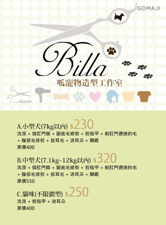 【Billa 呱寵物造型工作室】提供毛孩子的美容、洗澡、安親、接送等服務,專業、細心的呵護照料,讓貓狗自在享受美容修剪,主人也能放心託付給我們!Go麻吉,狗麻吉,寶貝洗澡無負擔,Billa呱寵物揪大家一起來拼經濟,現在歡慶開幕特別推出小型犬、中型犬和貓咪的洗香香體驗套裝,限時優惠價只要230元起喔!
