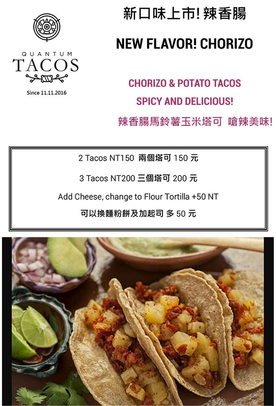 經由改良後的傳統滋味,在台發揚光大,一點都不用懼怕它的風味!〝QUANTUM TACOS 量子塔可〞將家鄉的好味道飄洋到這座擁有兩千三百萬人的小島,憑藉一股傻勁和熱情,期盼所有人能在不同的天空,一起看著相同的、那顆閃亮、代表希望、熱情的小太陽。