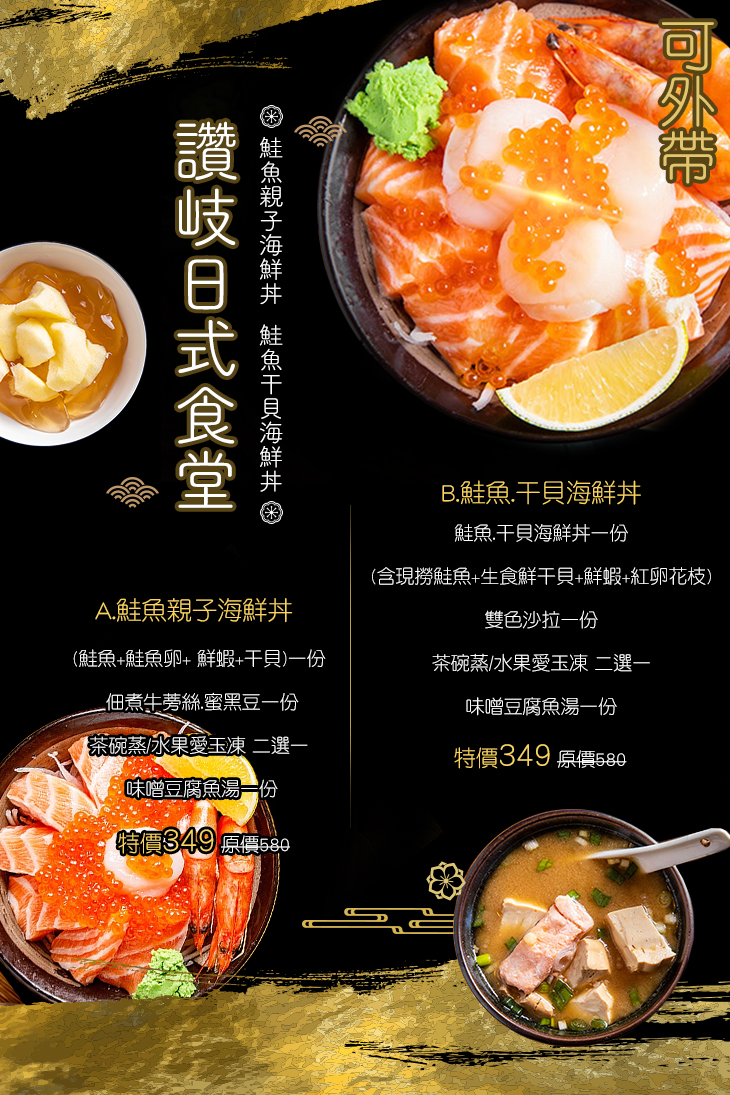 (鮭魚+鮭魚卵+ 鮮蝦+干貝)一份 + 佃煮牛蒡絲‧蜜黑豆一份 + 茶碗蒸/水果愛玉凍 二選一 + 味噌豆腐魚湯一份