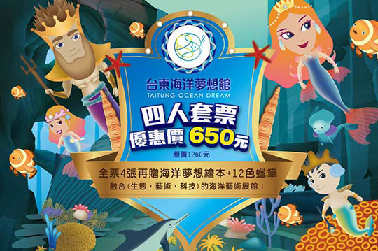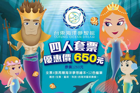 只要650元,即可享有【台東海洋夢想館】四人同行套票(麻吉獨享加贈繪本+12色蠟筆套裝商品一套)