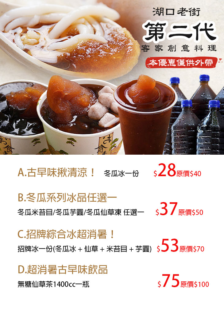 ➤為了因應炎熱的盛夏,【湖口老街第二代客家創意料理】特地推出清涼去火的古早冰品及飲品套餐,天然手熬的冬瓜冰、嫩仙草…樣樣都是令人回味無窮的好味道~事不宜遲,現在就快前往帶走一份經典不敗的懷舊古早味吧!