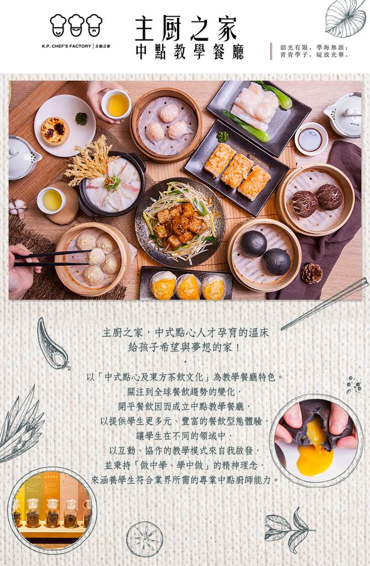 於2017年5月份成立的【主廚之家中點餐廳】,位於熱鬧的台北市大安區敦化南路二段上,鄰近梅花戲院及捷運六張犁站,交通便利。寬敞潔淨的用餐環境,以提供中式特色點心及道地東方茶飲聞名。隸屬於開平餐飲學校的【主廚之家中點餐廳】,所販售的餐點皆出自開平學生之手,就連餐廳服務員也是由學生親自擔任,尤為特色。中點教學餐廳成立至今,培育出許多餐飲界的菁英,將書本蓋上,讓學生實際上場學習,透過互動、協作的方式,體驗中餐、西餐、烘焙三大餐飲領域的真實面貌。一個為孩子培養能力、實現夢想的「主廚之家」,用汗水、用心血、用溫度做出的精緻佳餚,誠摯邀請您光臨品嚐!