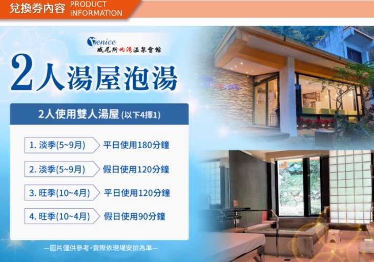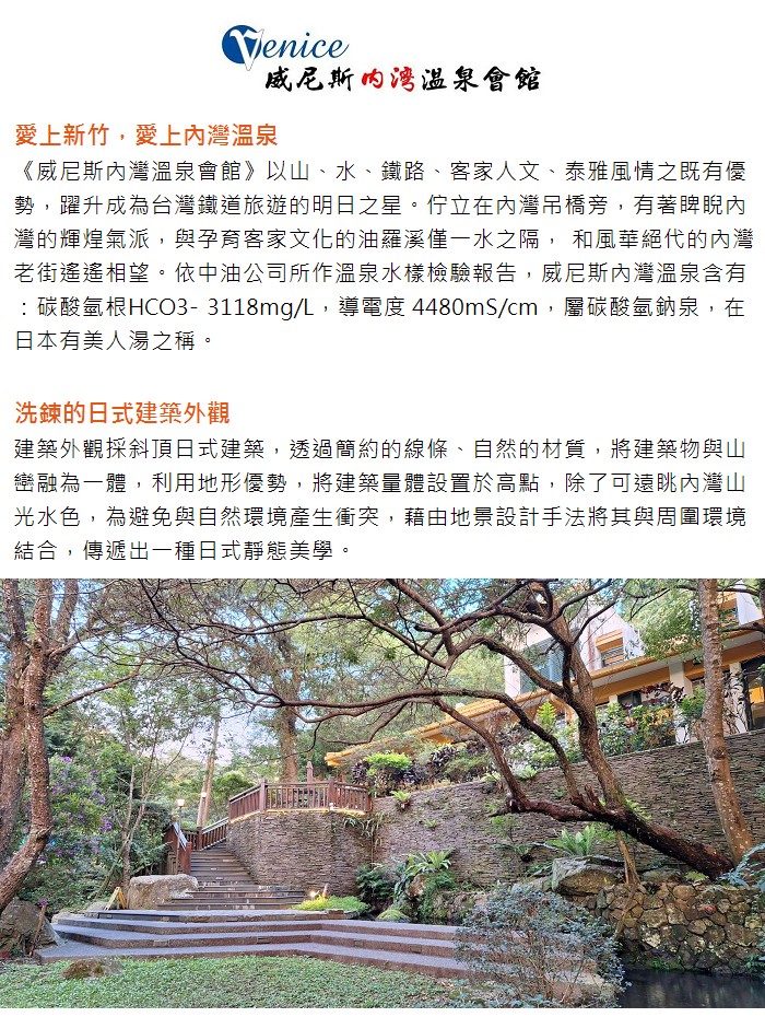 只要1220元,即可享有【新竹-威尼斯內灣溫泉會館】雙人湯屋泡湯券