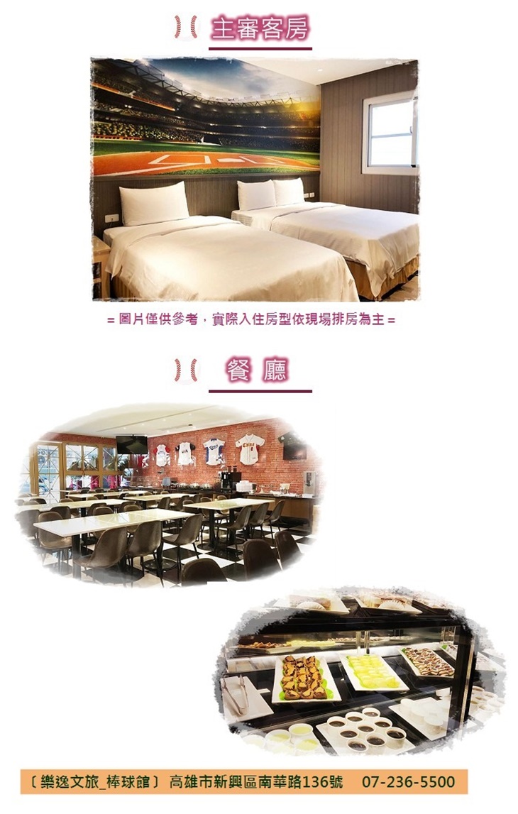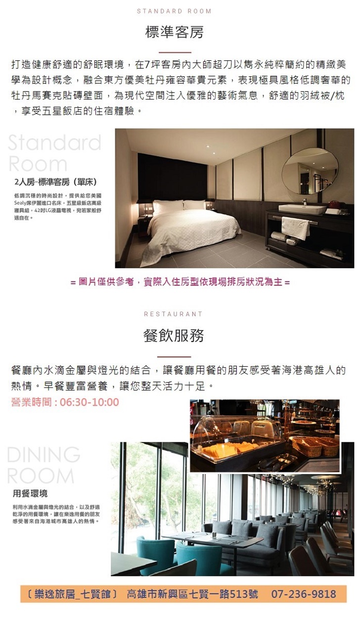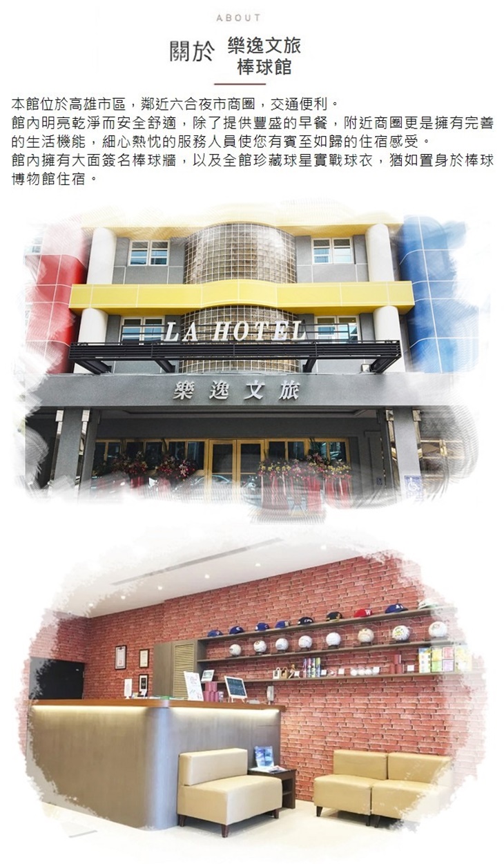 ※房型每間配置與設計格局不盡相同,依現場房況安排為主。 ※因應政府環保政策,不提供一次性備品 樂逸旅居七賢館 高雄市新興區七賢一路513號 電話: 07-236-9818 樂逸文旅棒球館 高雄市新興區南華路136號 電話: 07-236-5500 樂逸行旅南灣館 屏東縣恆春鎮南灣路126巷3號 電話: 08-888-3336