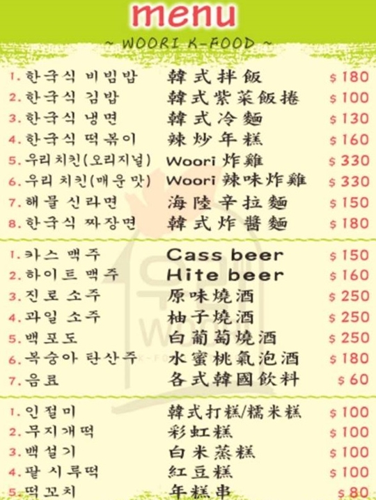 特別推薦:韓式拌飯、Woori炸雞、韓式炸醬麵、辣炒年糕