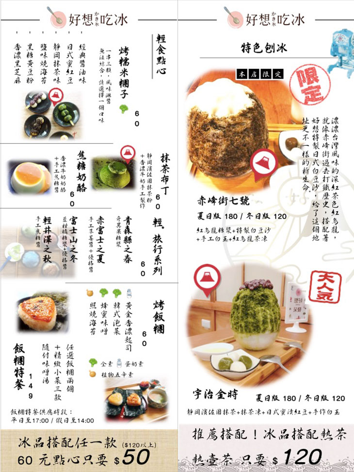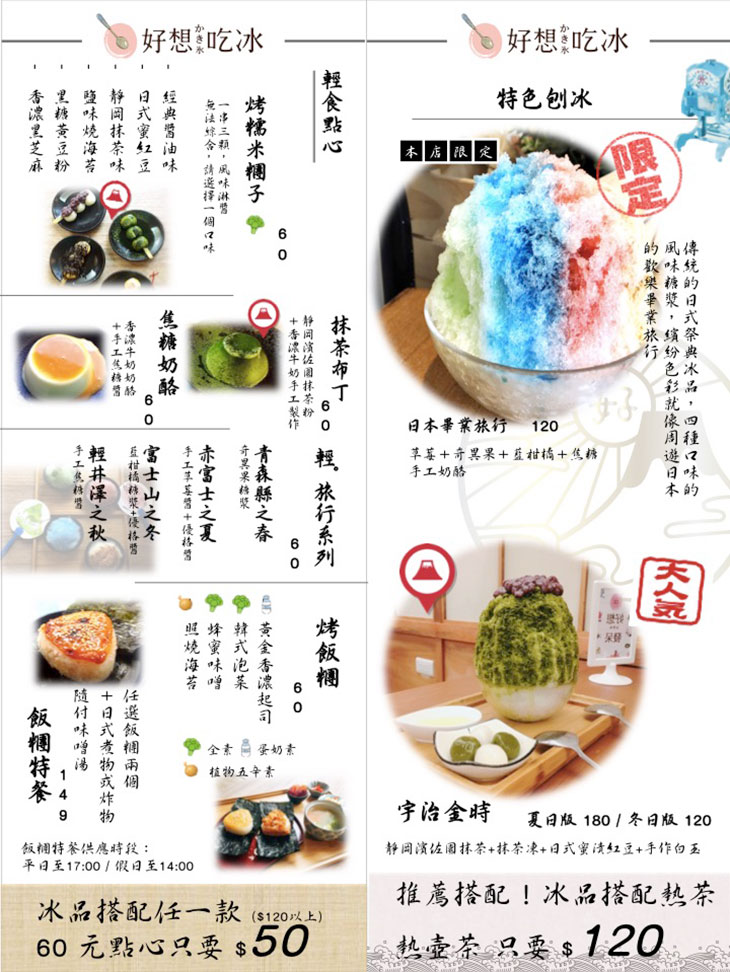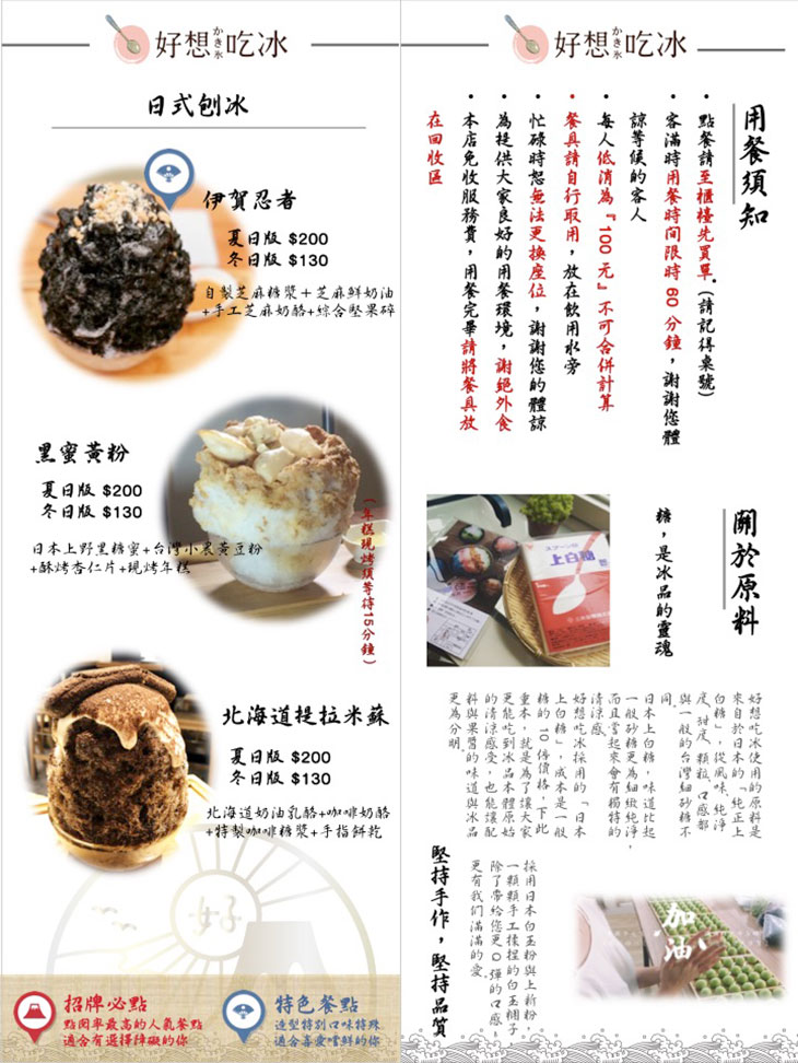 餐點以日式減糖冰品與手作蔬食餐點為主要訴求,使用之原物物料採日本進口之上白糖與白玉粉,與台灣在地小農原物料,帶給大家優質吃冰體驗;【好想吃冰かき氷】更提供健康蔬食的小點,發展蔬食餐廳相關餐飲系統。