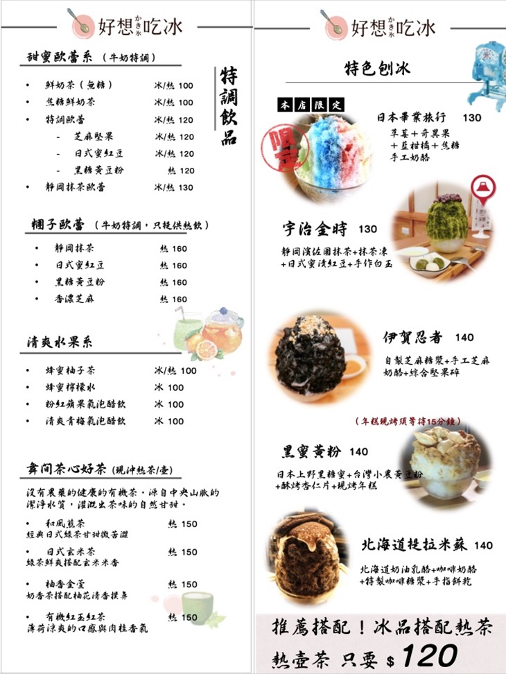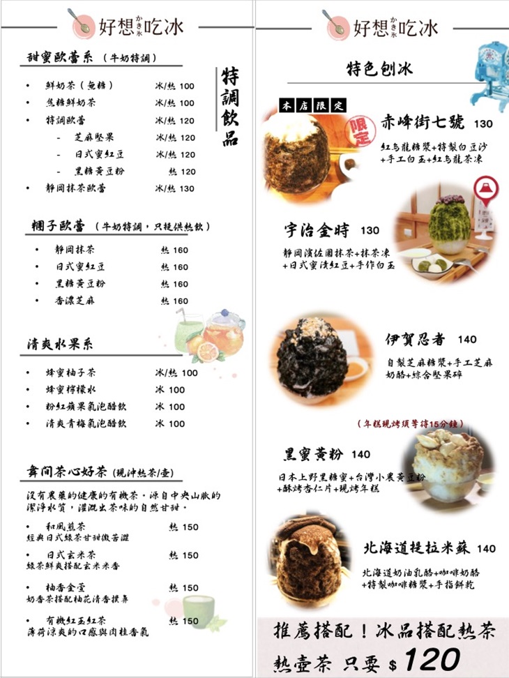 餐點以日式減糖冰品與手作蔬食餐點為主要訴求,使用之原物物料採日本進口之上白糖與白玉粉,與台灣在地小農原物料,帶給大家優質吃冰體驗;【好想吃冰かき氷】更提供健康蔬食的小點,發展蔬食餐廳相關餐飲系統。