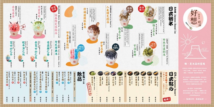 餐點以日式減糖冰品與手作蔬食餐點為主要訴求,使用之原物物料採日本進口之上白糖與白玉粉,與台灣在地小農原物料,帶給大家優質吃冰體驗!還有多種信義誠品店限定商品,歡迎大家來嚐鮮!