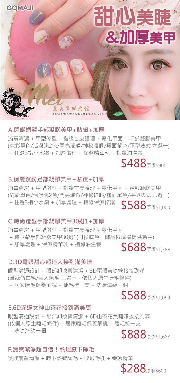 A.閃耀媚麗手部凝膠美甲+貼鑽+加厚 / B.俏麗繽紛足部凝膠美甲+貼鑽+加厚 / C.時尚造型手部凝膠美甲30選1+加厚 / D.3D電眼甜心超迷人接到滿美睫 / E.6D深邃女神山茶花接到滿美睫 / F.清爽潔淨超自信!熱蠟腋下除毛