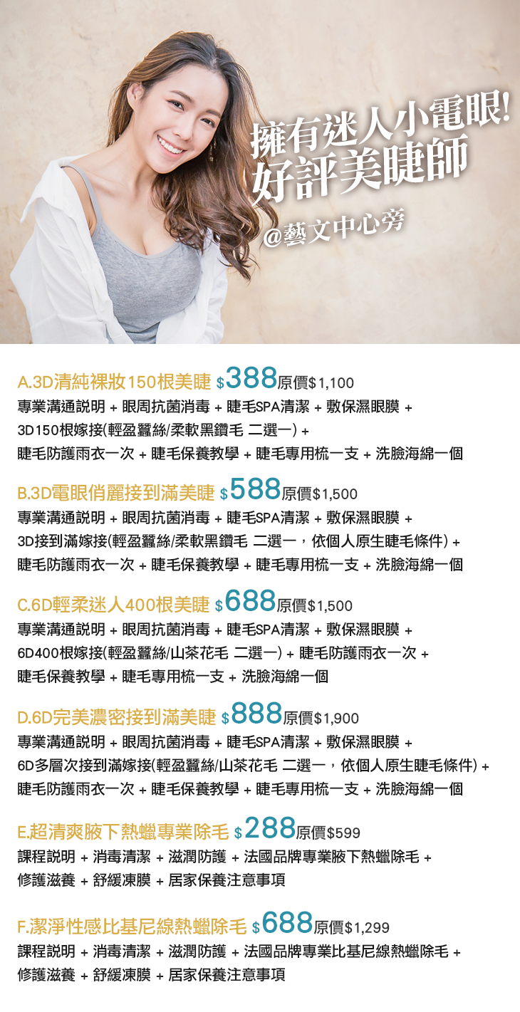 A.3D清純裸妝150根美睫 / B.3D電眼俏麗接到滿美睫 / C.6D輕柔迷人400根美睫 / D.6D完美濃密接到滿美睫 / E.超清爽腋下熱蠟專業除毛 / F.潔淨性感比基尼線熱蠟除毛