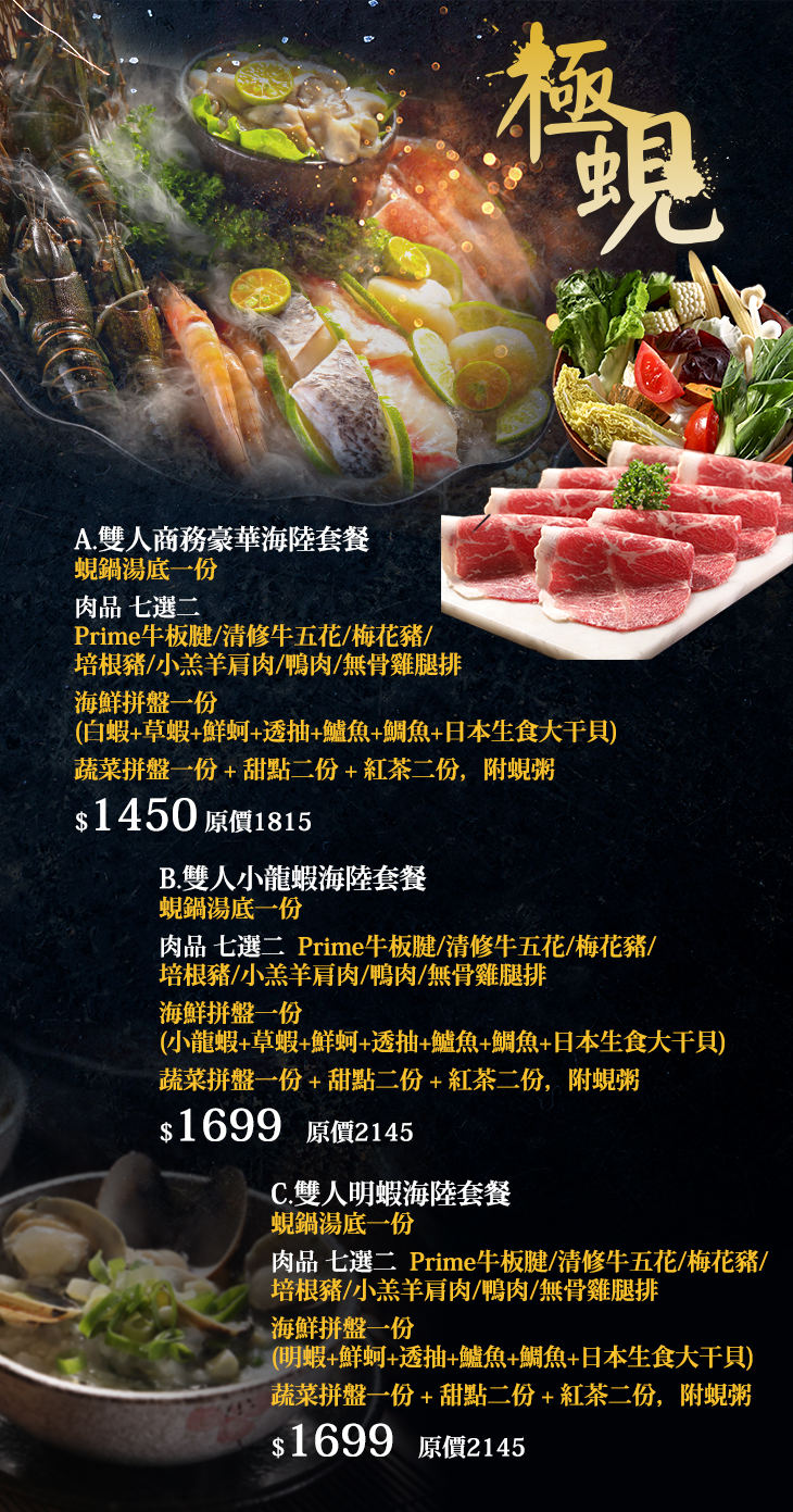 〈蜆鍋湯底一份 + 肉品:Prime牛板腱/清修牛五花/梅花豬/培根豬/小羔羊肩肉/鴨肉/無骨雞腿排 七選二 + 海鮮拼盤一份(小龍蝦+草蝦+鮮蚵+透抽+鱸魚+鯛魚+日本生食大干貝) + 蔬菜拼盤一份 + 甜點二份 + 紅茶二份,附蜆粥〉