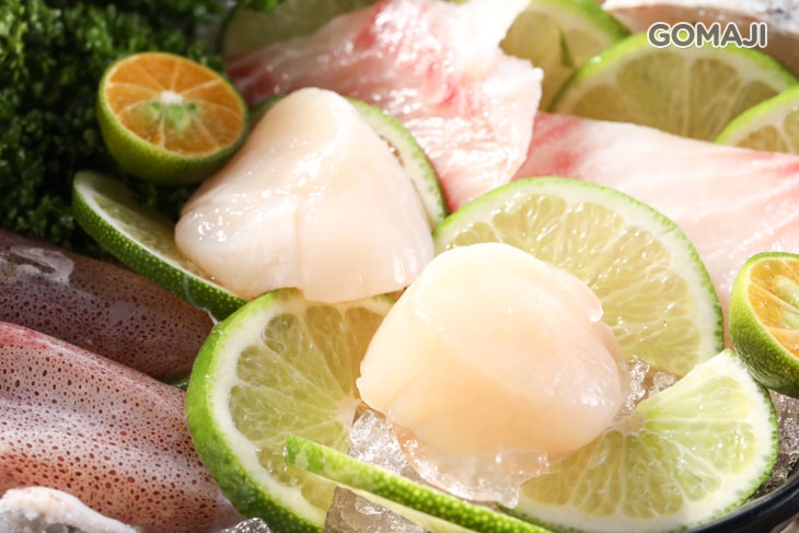 A海鮮拼盤一份(白蝦+草蝦+鮮蚵+透抽+鱸魚+鯛魚+日本生食大干貝)