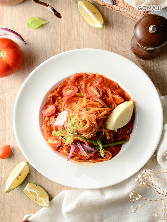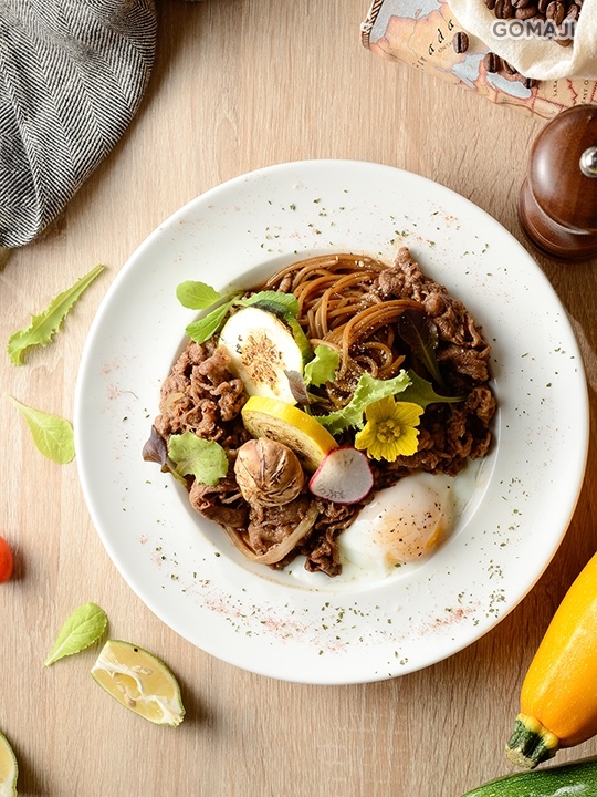 以台灣牛排風味醃製的牛五花肉片,低溫處理的溫泉蛋,請品嚐這亞洲與歐洲的完美碰撞!