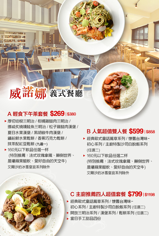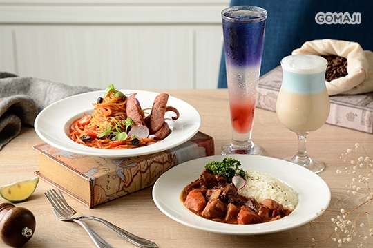經典歐式童話篇章系列/懷舊台灣味-初心系列/主廚特製沙司白脫飯系列 任選二 + 160元以下飲品任選二杯(特別推薦:法式玫瑰拿鐵、顛倒世界、晨曦蘋果醋飲、愛好自由的天空牛),艾爾沙的冰雪皇宮系列除外