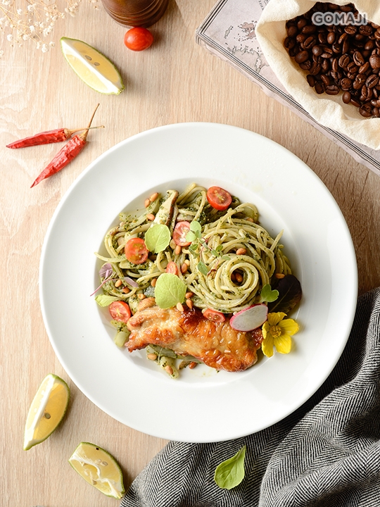 雞肉的多汁、松子的濃郁、檸檬的清爽,加上青醬的翠綠,這樣的搭配就像盛夏清爽的涼風!